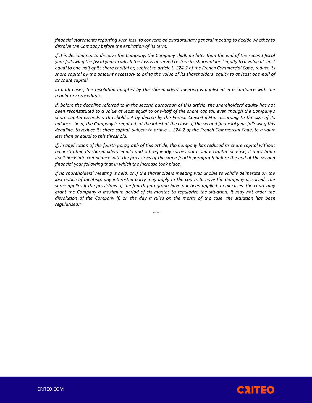 CRITEO.COM financial statements reporting such loss, to convene an extraordinary general meeting to decide whether to dissolve the Company before the expiration of its term. If it is decided not to dissolve the Company, the Company shall, no later than the end of the second fiscal year following the fiscal year in which the loss is observed restore its shareholders' equity to a value at least equal to one-half of its share capital or, subject to article L. 224-2 of the French Commercial Code, reduce its share capital by the amount necessary to bring the value of its shareholders' equity to at least one-half of its share capital. In both cases, the resolution adopted by the shareholders’ meeting is published in accordance with the regulatory procedures. If, before the deadline referred to in the second paragraph of this article, the shareholders' equity has not been reconstituted to a value at least equal to one-half of the share capital, even though the Company's share capital exceeds a threshold set by decree by the French Conseil d'Etat according to the size of its balance sheet, the Company is required, at the latest at the close of the second financial year following this deadline, to reduce its share capital, subject to article L. 224-2 of the French Commercial Code, to a value less than or equal to this threshold. If, in application of the fourth paragraph of this article, the Company has reduced its share capital without reconstituting its shareholders' equity and subsequently carries out a share capital increase, it must bring itself back into compliance with the provisions of the same fourth paragraph before the end of the second financial year following that in which the increase took place. If no shareholders’ meeting is held, or if the shareholders meeting was unable to validly deliberate on the last notice of meeting, any interested party may apply to the courts to have the Company dissolved. The same applies if the provisions of the fourth paragraph have not been applied. In all cases, the court may grant the Company a maximum period of six months to regularize the situation. It may not order the dissolution of the Company if, on the day it rules on the merits of the case, the situation has been regularized.” ***