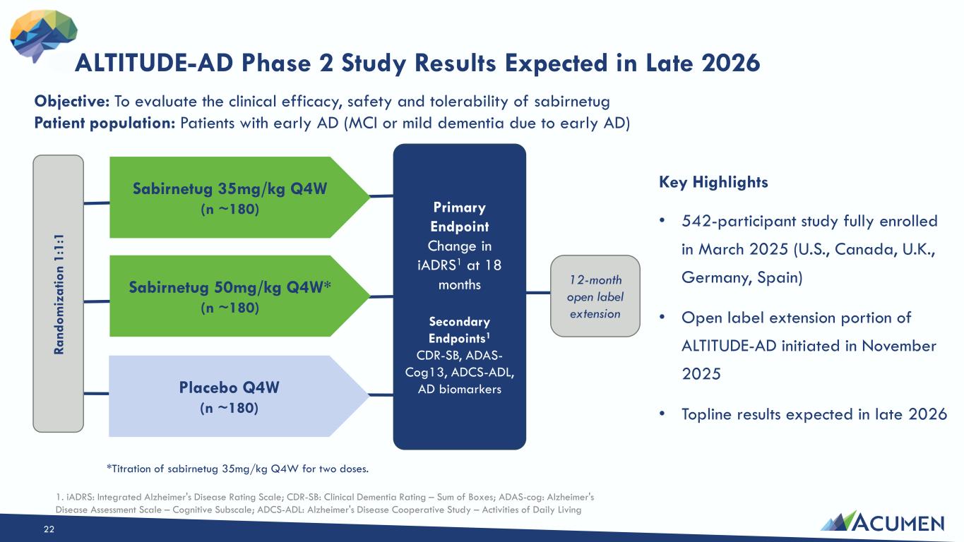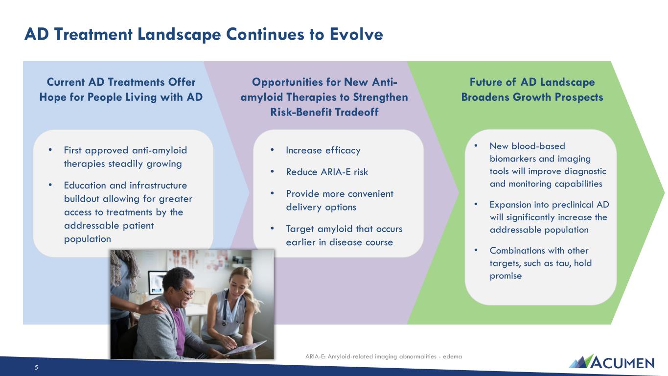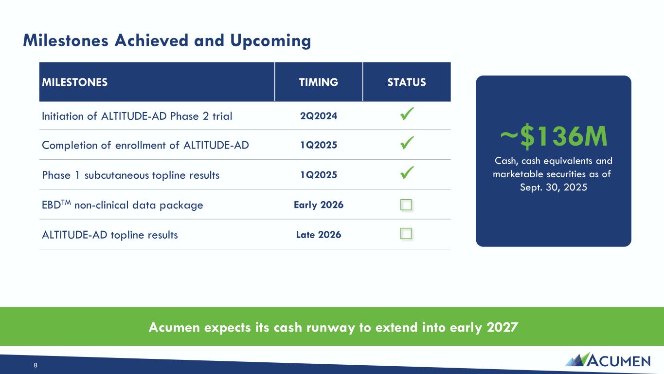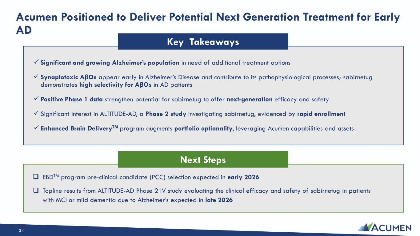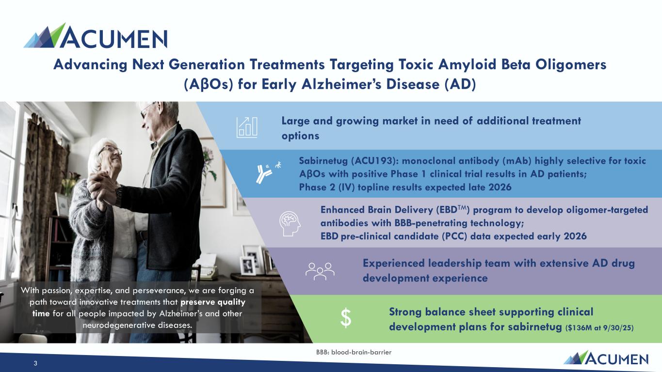 Forward-Looking Statements 2 This presentation contains forward-looking statements within the meaning of The Private Securities Litigation Reform Act of 1995. Any statement describing Acumen’s goals, expectations, financial or other projections, intentions or beliefs is a forward-looking statement and should be considered an at-risk statement. Words such as “believes,” “expects,” “anticipates,” “could,” “would,” “seeks,” “aims,” “plans,” “potential,” “will” and similar expressions are intended to identify forward-looking statements, although not all forward-looking statements contain these identifying words. Forward-looking statements include statements concerning Acumen’s business, and Acumen’s ability to achieve its strategic and financial goals, including its projected use of cash, cash equivalents and marketable securities and the expected sufficiency of its cash resources into early 2027, the therapeutic potential of Acumen’s product candidate, sabirnetug (ACU193), including against other antibodies, the timing of anticipated topline results of ALTITUDE-AD, the potential for additional development to support a subcutaneous dosing option of sabirnetug, and the potential to develop a candidate to treat Alzheimer's Disease utilizing EBD technology. These statements are based upon the current beliefs and expectations of Acumen management, and are subject to certain factors, risks and uncertainties, particularly those inherent in the process of discovering, developing and commercializing safe and effective human therapeutics. Such risks may be amplified by the impacts of the COVID-19 pandemic. These and other risks concerning Acumen’s programs are described in additional detail in Acumen’s filings with the Securities and Exchange Commission (“SEC”), including in Acumen’s most recent Annual Report Form 10-K and future filings and reports by Acumen. Copies of these and other documents are available from Acumen. Additional information will be made available in other filings that Acumen makes from time to time with the SEC. These forward- looking statements speak only as of the date hereof, and Acumen expressly disclaims any obligation to update or revise any forward- looking statement, except as otherwise required by law, whether, as a result of new information, future events or otherwise. In this presentation, references to cash also include cash equivalents.