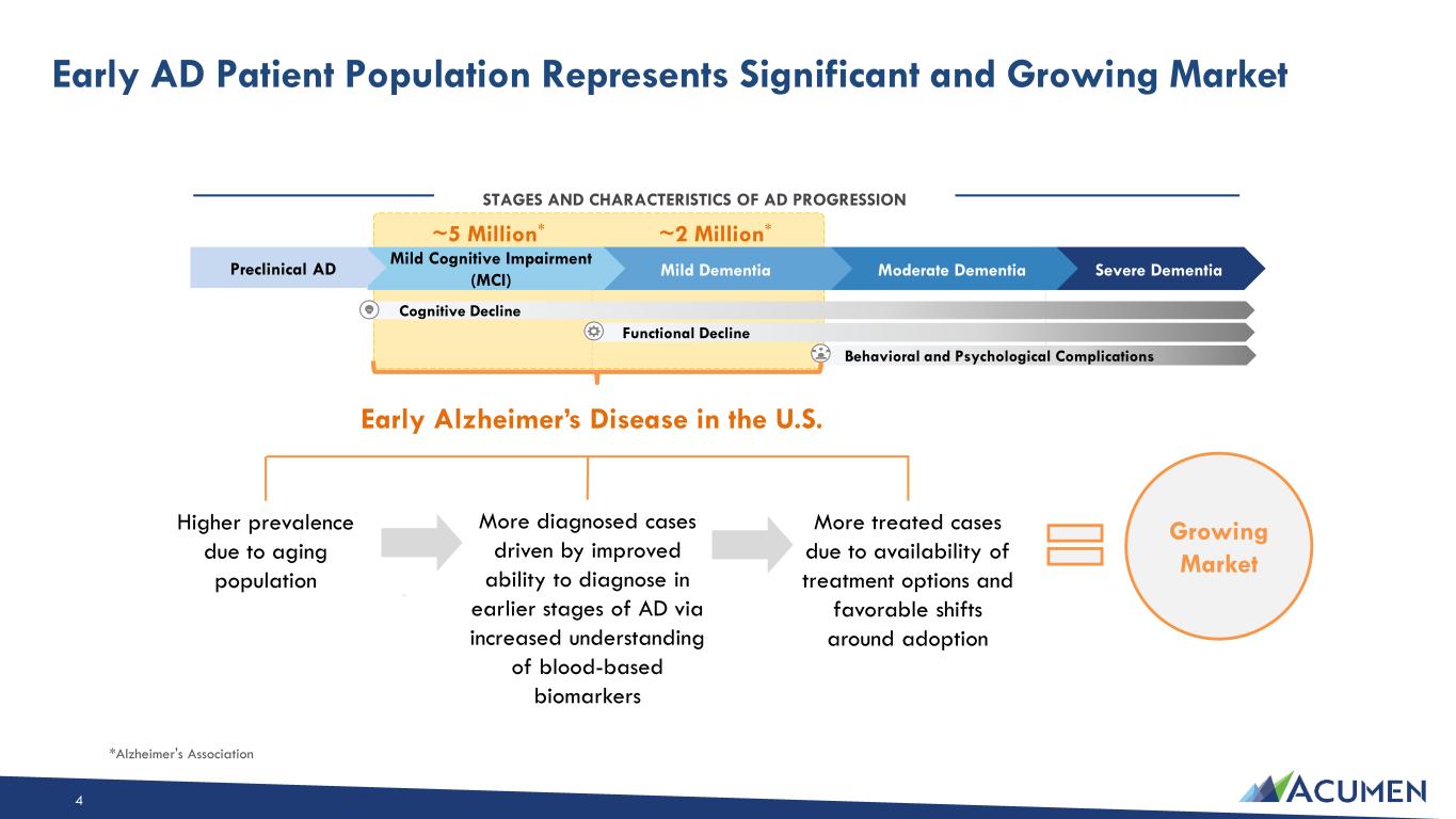 3 Advancing Next Generation Treatments Targeting Toxic Amyloid Beta Oligomers (AβOs) for Early Alzheimer’s Disease (AD) With passion, expertise, and perseverance, we are forging a path toward innovative treatments that preserve quality time for all people impacted by Alzheimer’s and other neurodegenerative diseases. Large and growing market in need of additional treatment options Sabirnetug (ACU193): monoclonal antibody (mAb) highly selective for toxic AβOs with positive Phase 1 clinical trial results in AD patients; Phase 2 (IV) topline results expected late 2026 Enhanced Brain Delivery (EBDTM) program to develop oligomer-targeted antibodies with BBB-penetrating technology; EBD pre-clinical candidate (PCC) data expected early 2026 Experienced leadership team with extensive AD drug development experience Strong balance sheet supporting clinical development plans for sabirnetug ($136M at 9/30/25) $ BBB: blood-brain-barrier