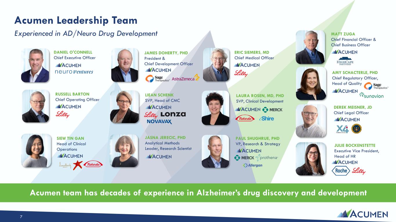 6 Phase 1 Phase 2 Phase 3Preclinical Intravenous (IV) Subcutaneous (SC) Fully enrolled, Phase 2 topline results expected late 2026 Phase 1 topline results announced March 2025 support further development EBD-ACU193 Pre-clinical candidate (PCC) data expected early 2026, option to develop up to two EBD development candidates for the treatment of AD 2026 a Pivotal Year for Acumen’s Pipeline Sabirnetug Global Phase 2 Study Results & Next Generation EBDTM Candidate Selection Sabirnetug (ACU193) Enhanced brain delivery (EBD) EBD-ACU234 TfR-Brain transporter + anti-AO mAb