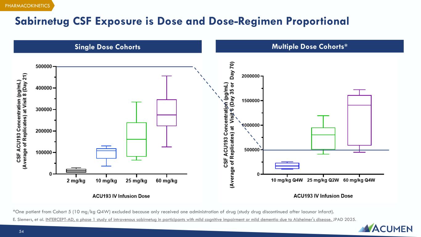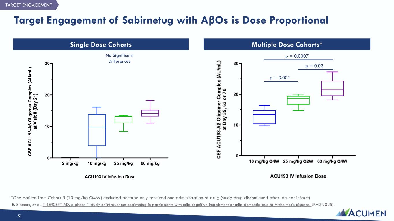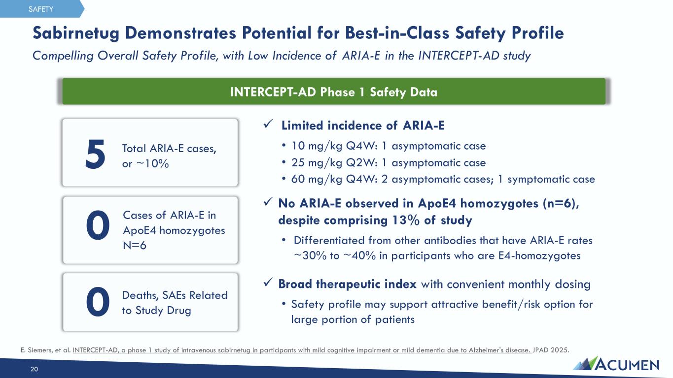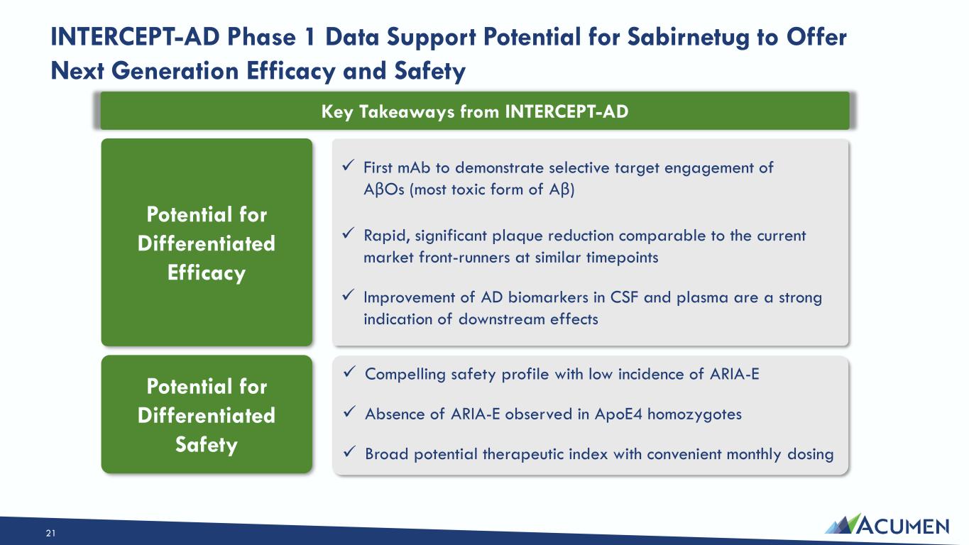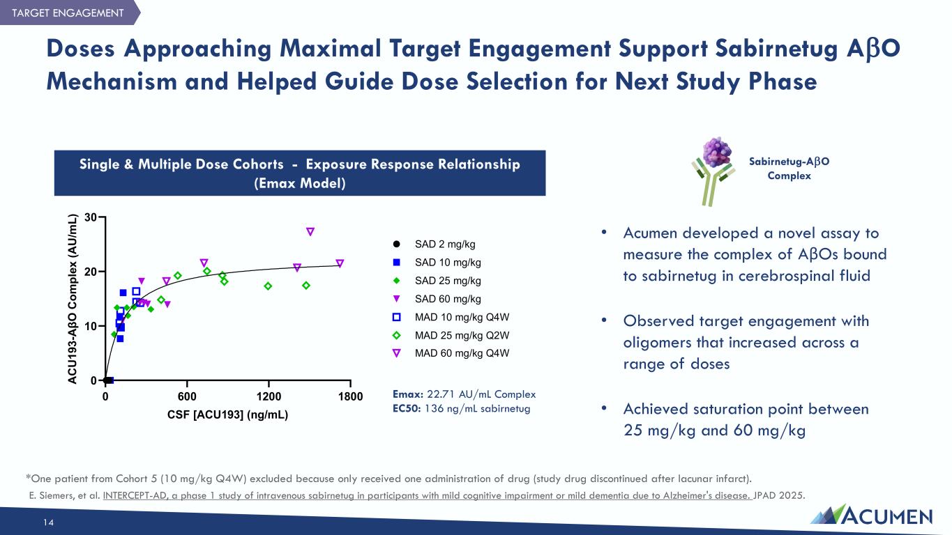 Doses Approaching Maximal Target Engagement Support Sabirnetug AO Mechanism and Helped Guide Dose Selection for Next Study Phase 14 Single & Multiple Dose Cohorts - Exposure Response Relationship (Emax Model) Emax: 22.71 AU/mL Complex EC50: 136 ng/mL sabirnetug 0 600 1200 1800 0 10 20 30 CSF [ACU193] (ng/mL) A C U 1 9 3 -A β O C o m p le x ( A U /m L ) SAD 2 mg/kg SAD 10 mg/kg SAD 25 mg/kg SAD 60 mg/kg MAD 10 mg/kg Q4W MAD 60 mg/kg Q4W MAD 25 mg/kg Q2W Sabirnetug-AO Complex TARGET ENGAGEMENT *One patient from Cohort 5 (10 mg/kg Q4W) excluded because only received one administration of drug (study drug discontinued after lacunar infarct). E. Siemers, et al. INTERCEPT-AD, a phase 1 study of intravenous sabirnetug in participants with mild cognitive impairment or mild dementia due to Alzheimer's disease. JPAD 2025. • Acumen developed a novel assay to measure the complex of AβOs bound to sabirnetug in cerebrospinal fluid • Observed target engagement with oligomers that increased across a range of doses • Achieved saturation point between 25 mg/kg and 60 mg/kg