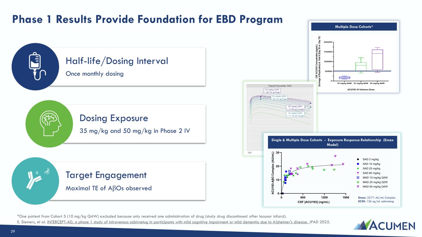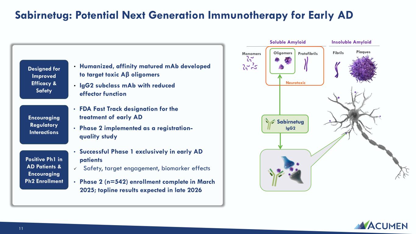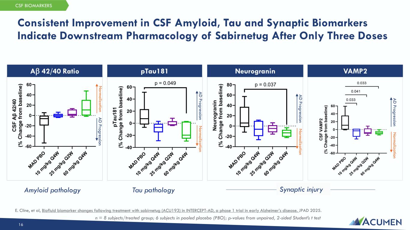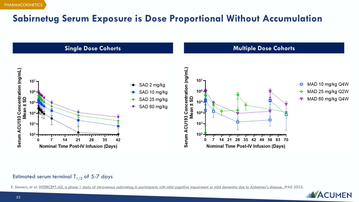 Doses Approaching Maximal Target Engagement Support Sabirnetug AO Mechanism and Helped Guide Dose Selection for Next Study Phase 14 Single & Multiple Dose Cohorts - Exposure Response Relationship (Emax Model) Emax: 22.71 AU/mL Complex EC50: 136 ng/mL sabirnetug 0 600 1200 1800 0 10 20 30 CSF [ACU193] (ng/mL) A C U 1 9 3 -A β O C o m p le x ( A U /m L ) SAD 2 mg/kg SAD 10 mg/kg SAD 25 mg/kg SAD 60 mg/kg MAD 10 mg/kg Q4W MAD 60 mg/kg Q4W MAD 25 mg/kg Q2W Sabirnetug-AO Complex TARGET ENGAGEMENT *One patient from Cohort 5 (10 mg/kg Q4W) excluded because only received one administration of drug (study drug discontinued after lacunar infarct). E. Siemers, et al. INTERCEPT-AD, a phase 1 study of intravenous sabirnetug in participants with mild cognitive impairment or mild dementia due to Alzheimer's disease. JPAD 2025. • Acumen developed a novel assay to measure the complex of AβOs bound to sabirnetug in cerebrospinal fluid • Observed target engagement with oligomers that increased across a range of doses • Achieved saturation point between 25 mg/kg and 60 mg/kg