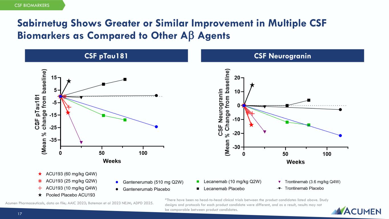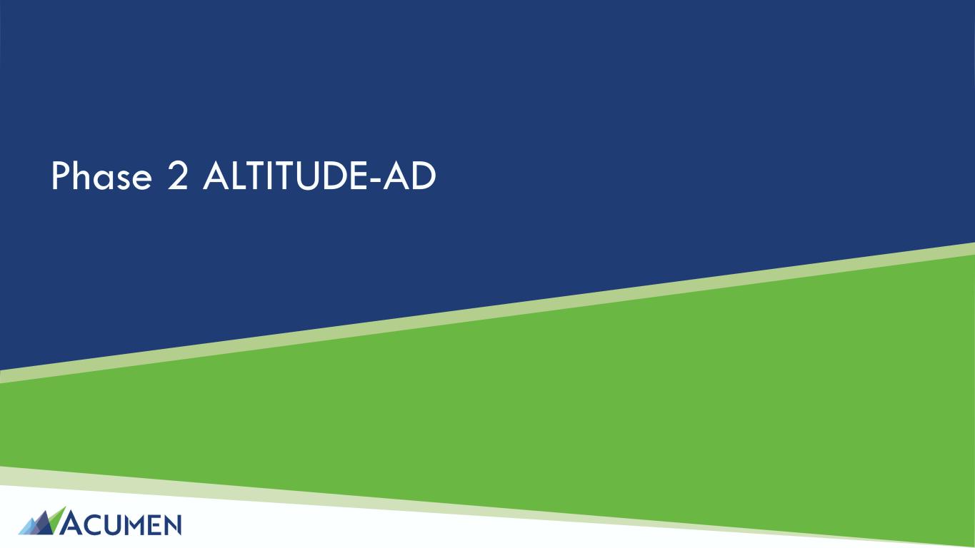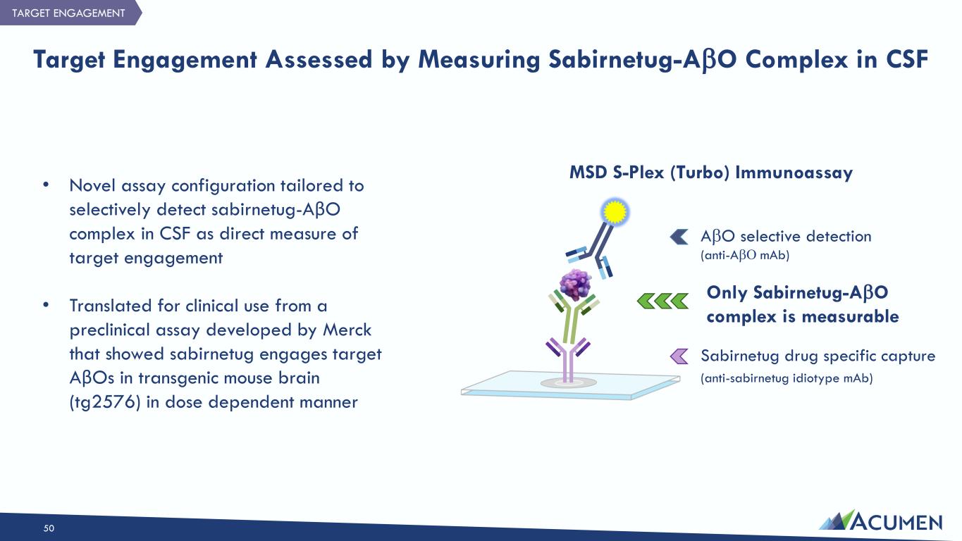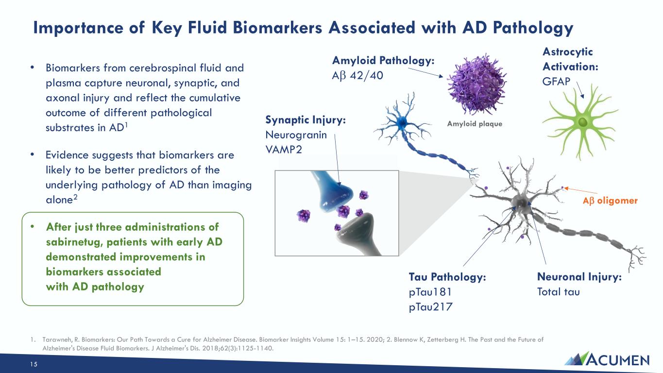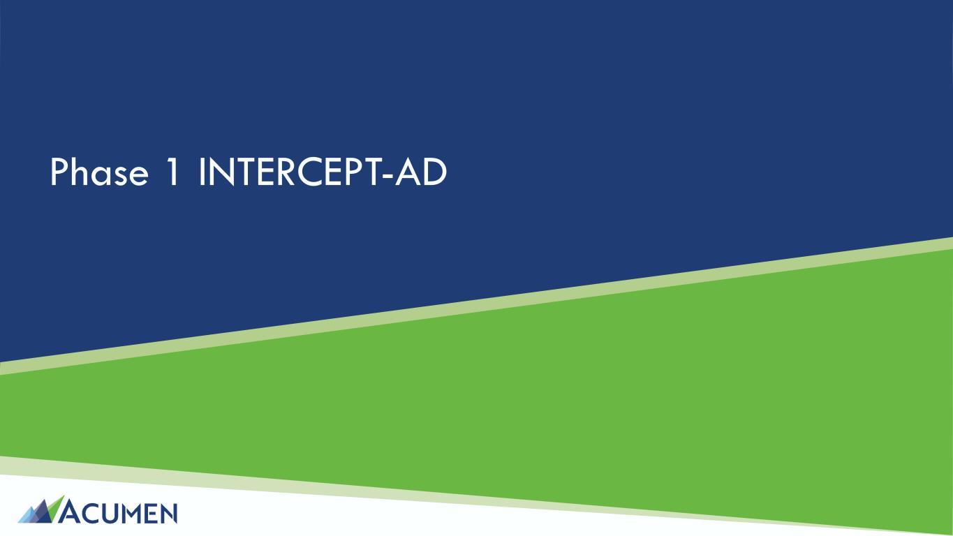 Doses Approaching Maximal Target Engagement Support Sabirnetug AO Mechanism and Helped Guide Dose Selection for Next Study Phase 14 Single & Multiple Dose Cohorts - Exposure Response Relationship (Emax Model) Emax: 22.71 AU/mL Complex EC50: 136 ng/mL sabirnetug 0 600 1200 1800 0 10 20 30 CSF [ACU193] (ng/mL) A C U 1 9 3 -A β O C o m p le x ( A U /m L ) SAD 2 mg/kg SAD 10 mg/kg SAD 25 mg/kg SAD 60 mg/kg MAD 10 mg/kg Q4W MAD 60 mg/kg Q4W MAD 25 mg/kg Q2W Sabirnetug-AO Complex TARGET ENGAGEMENT *One patient from Cohort 5 (10 mg/kg Q4W) excluded because only received one administration of drug (study drug discontinued after lacunar infarct). E. Siemers, et al. INTERCEPT-AD, a phase 1 study of intravenous sabirnetug in participants with mild cognitive impairment or mild dementia due to Alzheimer's disease. JPAD 2025. • Acumen developed a novel assay to measure the complex of AβOs bound to sabirnetug in cerebrospinal fluid • Observed target engagement with oligomers that increased across a range of doses • Achieved saturation point between 25 mg/kg and 60 mg/kg