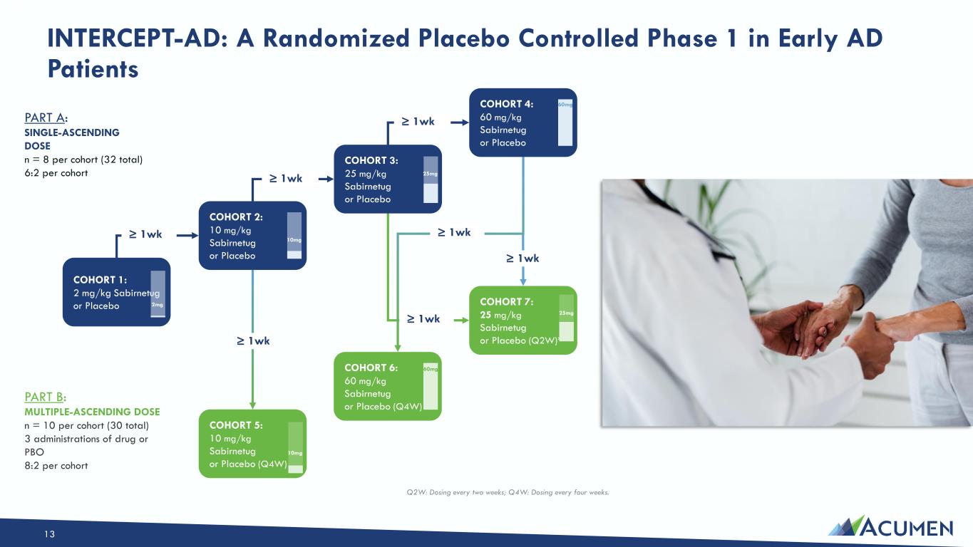 Q2W: Dosing every two weeks; Q4W: Dosing every four weeks. PART A: SINGLE-ASCENDING DOSE n = 8 per cohort (32 total) 6:2 per cohort PART B: MULTIPLE-ASCENDING DOSE n = 10 per cohort (30 total) 3 administrations of drug or PBO 8:2 per cohort COHORT 1: 2 mg/kg Sabirnetug or Placebo 2mg COHORT 2: 10 mg/kg Sabirnetug or Placebo 10mg COHORT 3: 25 mg/kg Sabirnetug or Placebo 25mg COHORT 4: 60 mg/kg Sabirnetug or Placebo 60mg COHORT 5: 10 mg/kg Sabirnetug or Placebo (Q4W) 10mg COHORT 6: 60 mg/kg Sabirnetug or Placebo (Q4W) 60mg COHORT 7: 25 mg/kg Sabirnetug or Placebo (Q2W)* ≥ 1wk ≥ 1wk ≥ 1wk ≥ 1wk ≥ 1wk ≥ 1wk 25mg ≥ 1wk INTERCEPT-AD: A Randomized Placebo Controlled Phase 1 in Early AD Patients 13