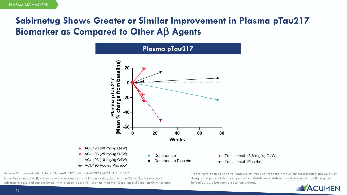 Sabirnetug Shows Greater or Similar Improvement in Multiple CSF Biomarkers as Compared to Other A Agents 17 CSF BIOMARKERS CSF NeurograninCSF pTau181 50 100 -35 -25 -15 -5 5 15 Weeks C S F p T a u 1 8 1 (M e a n % c h a n g e f ro m b a s e li n e ) Gantenerumab (510 mg Q2W) Gantenerumab Placebo ACU193 (60 mg/kg Q4W) ACU193 (25 mg/kg Q2W) ACU193 (10 mg/kg Q4W) Pooled Placebo ACU193 Lecanemab (10 mg/kg Q2W) Lecanemab Placebo Trontinemab (3.6 mg/kg Q4W) C S F p T a u 1 8 1 (M e a n % c h a n g e f ro m b a s e li n e ) 50 100 -35 -25 -15 -5 5 15 Weeks C S F p T a u 1 8 1 (M e a n % c h a n g e f ro m b a s e li n e ) Gantenerumab (510 mg Q2W) Gantenerumab Placebo ACU193 (60 mg/kg Q4W) ACU193 (25 mg/kg Q2W) ACU193 (10 mg/kg Q4W) Pooled Placebo ACU193 Lecanemab (10 mg/kg Q2W) Lecanemab Placebo Trontinemab (3.6 mg/kg Q4W) 50 100 -35 -25 -15 -5 5 15 Weeks C S F p T a u 1 8 1 (M e a n % c h a n g e f ro m b a s e li n e ) Gantenerumab (510 mg Q2W) Gantenerumab Placebo ACU193 (60 mg/kg Q4W) ACU193 (25 mg/kg Q2W) ACU193 (10 mg/kg Q4W) Pooled Placebo ACU193 Lecanemab (10 mg/kg Q2W) Lecanemab Placebo Trontinemab (3.6 mg/kg Q4W) *There have been no head-to-head clinical trials between the product candidates listed above. Study designs and protocols for each product candidate were different, and as a result, results may not be comparable between product candidates. Acumen Pharmaceuticals, data on file; AAIC 2023; Bateman et al 2023 NEJM; ADPD 2025.