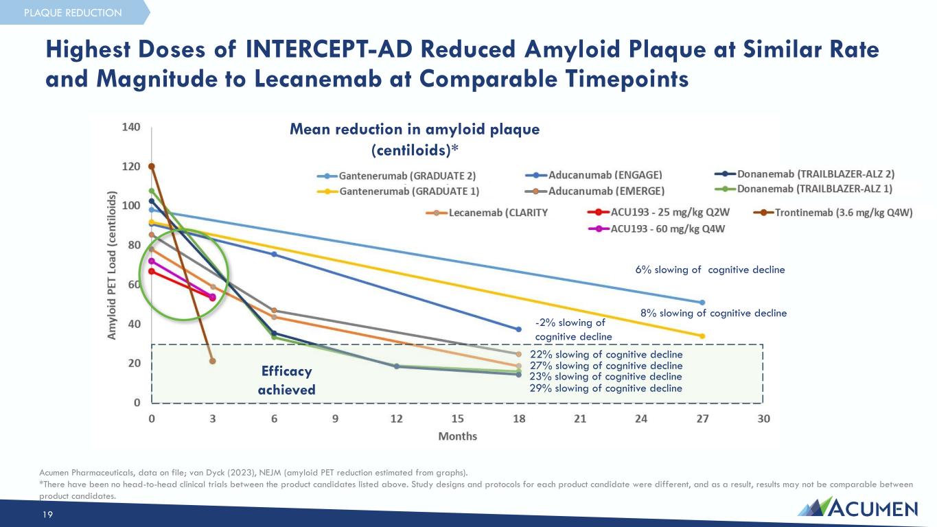 Sabirnetug Shows Greater or Similar Improvement in Plasma pTau217 Biomarker as Compared to Other A Agents 18 PLASMA BIOMARKERS Plasma pTau217 *There have been no head-to-head clinical trials between the product candidates listed above. Study designs and protocols for each product candidate were different, and as a result, results may not be comparable between product candidates. Acumen Pharmaceuticals, data on file; AAIC 2023; Sims et al 2023 JAMA; ADPD 2025. Note: More impact to fluid biomarkers was observed with longer dosing duration; the 25 mg/kg Q2W cohort differed in dose and sample timing, with drug on board for less time than the 10 mg/kg & 60 mg/kg Q4W cohorts