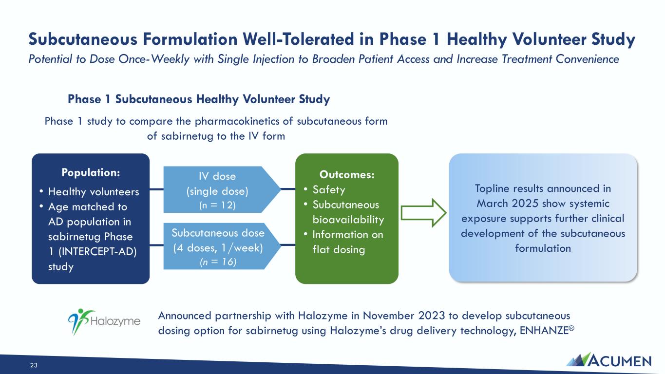 R a n d o m iz a ti o n 1 :1 :1 Sabirnetug 35mg/kg Q4W (n ~180) Sabirnetug 50mg/kg Q4W* (n ~180) Placebo Q4W (n ~180) Primary Endpoint Change in iADRS1 at 18 months Secondary Endpoints1 CDR-SB, ADAS- Cog13, ADCS-ADL, AD biomarkers 12-month open label extension Objective: To evaluate the clinical efficacy, safety and tolerability of sabirnetug Patient population: Patients with early AD (MCI or mild dementia due to early AD) ALTITUDE-AD Phase 2 Study Results Expected in Late 2026 1. iADRS: Integrated Alzheimer's Disease Rating Scale; CDR-SB: Clinical Dementia Rating – Sum of Boxes; ADAS-cog: Alzheimer's Disease Assessment Scale – Cognitive Subscale; ADCS-ADL: Alzheimer's Disease Cooperative Study – Activities of Daily Living 22 *Titration of sabirnetug 35mg/kg Q4W for two doses. • 542-participant study fully enrolled in March 2025 (U.S., Canada, U.K., Germany, Spain) • Open label extension portion of ALTITUDE-AD initiated in November 2025 • Topline results expected in late 2026 Key Highlights