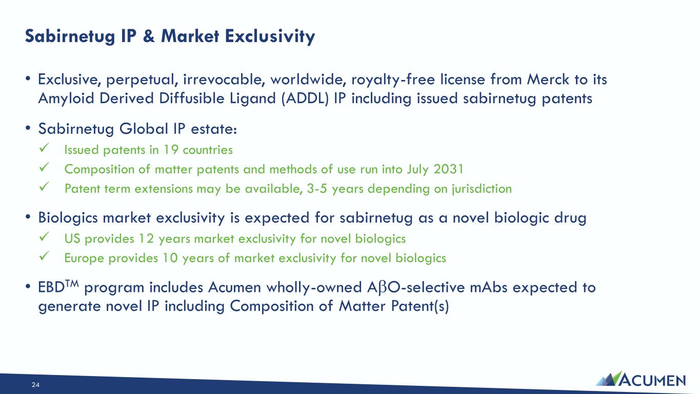 Sabirnetug IP & Market Exclusivity • Exclusive, perpetual, irrevocable, worldwide, royalty-free license from Merck to its Amyloid Derived Diffusible Ligand (ADDL) IP including issued sabirnetug patents • Sabirnetug Global IP estate: ✓ Issued patents in 19 countries ✓ Composition of matter patents and methods of use run into July 2031 ✓ Patent term extensions may be available, 3-5 years depending on jurisdiction • Biologics market exclusivity is expected for sabirnetug as a novel biologic drug ✓ US provides 12 years market exclusivity for novel biologics ✓ Europe provides 10 years of market exclusivity for novel biologics • EBDTM program includes Acumen wholly-owned AO-selective mAbs expected to generate novel IP including Composition of Matter Patent(s) 24