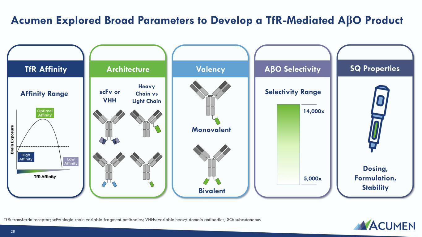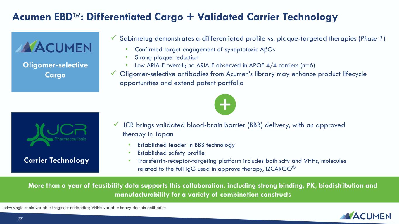 Acumen EBDTM: Differentiated Cargo + Validated Carrier Technology 27 ✓ JCR brings validated blood-brain barrier (BBB) delivery, with an approved therapy in Japan • Established leader in BBB technology • Established safety profile • Transferrin-receptor-targeting platform includes both scFv and VHHs, molecules related to the full IgG used in approve therapy, IZCARGO® Carrier Technology Oligomer-selective Cargo ✓ Sabirnetug demonstrates a differentiated profile vs. plaque-targeted therapies (Phase 1) • Confirmed target engagement of synaptotoxic AOs • Strong plaque reduction • Low ARIA-E overall; no ARIA-E observed in APOE 4/4 carriers (n=6) ✓ Oligomer-selective antibodies from Acumen’s library may enhance product lifecycle opportunities and extend patent portfolio scFv: single chain variable fragment antibodies; VHHs: variable heavy domain antibodies ✓ More than a year of feasibility data supports this collaboration, including strong binding, PK, biodistribution and manufacturability for a variety of combination constructs