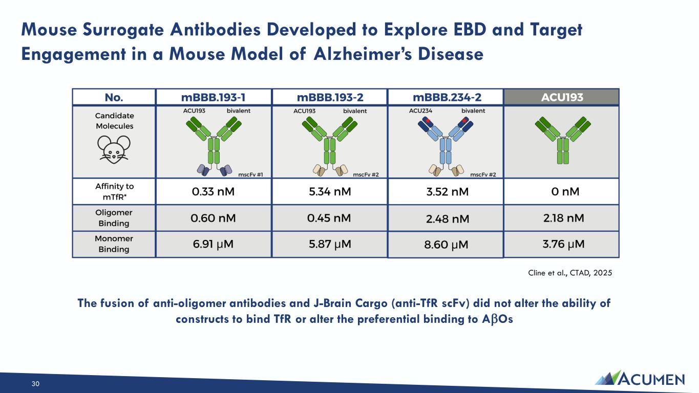 Multiple Dose Cohorts* Half-life/Dosing Interval Once monthly dosing Dosing Exposure 35 mg/kg and 50 mg/kg in Phase 2 IV Target Engagement Maximal TE of AβOs observed Phase 1 Results Provide Foundation for EBD Program 29 Single & Multiple Dose Cohorts - Exposure Response Relationship (Emax Model) Emax: 22.71 AU/mL Complex EC50: 136 ng/mL sabirnetug 0 600 1200 1800 0 10 20 30 CSF [ACU193] (ng/mL) A C U 1 9 3 -A β O C o m p le x ( A U /m L ) SAD 2 mg/kg SAD 10 mg/kg SAD 25 mg/kg SAD 60 mg/kg MAD 10 mg/kg Q4W MAD 60 mg/kg Q4W MAD 25 mg/kg Q2W *One patient from Cohort 5 (10 mg/kg Q4W) excluded because only received one administration of drug (study drug discontinued after lacunar infarct). E. Siemers, et al. INTERCEPT-AD, a phase 1 study of intravenous sabirnetug in participants with mild cognitive impairment or mild dementia due to Alzheimer's disease. JPAD 2025.