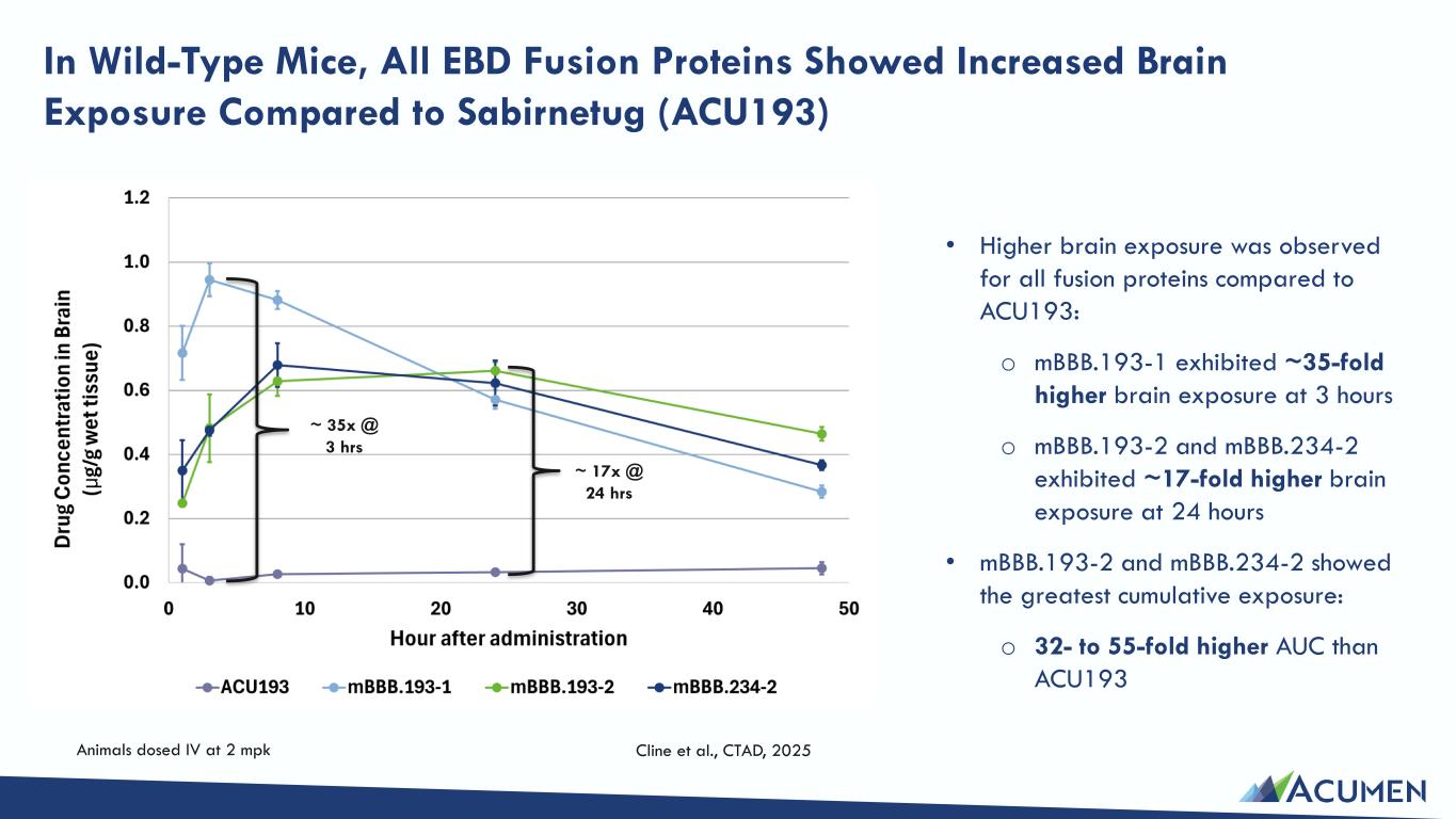 Animals dosed IV at 2 mpk Cline et al., CTAD, 2025 • Higher brain exposure was observed for all fusion proteins compared to ACU193: o mBBB.193-1 exhibited ~35-fold higher brain exposure at 3 hours o mBBB.193-2 and mBBB.234-2 exhibited ~17-fold higher brain exposure at 24 hours • mBBB.193-2 and mBBB.234-2 showed the greatest cumulative exposure: o 32- to 55-fold higher AUC than ACU193 In Wild-Type Mice, All EBD Fusion Proteins Showed Increased Brain Exposure Compared to Sabirnetug (ACU193) ~ 35x @ 3 hrs ~ 17x @ 24 hrs