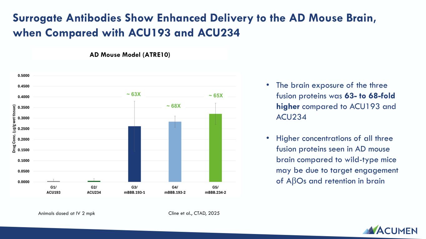 Surrogate Antibodies Show Enhanced Delivery to the AD Mouse Brain, when Compared with ACU193 and ACU234 AD Mouse Model (ATRE10) Animals dosed at IV 2 mpk Cline et al., CTAD, 2025 • The brain exposure of the three fusion proteins was 63- to 68-fold higher compared to ACU193 and ACU234 • Higher concentrations of all three fusion proteins seen in AD mouse brain compared to wild-type mice may be due to target engagement of AOs and retention in brain ~ 63X ~ 68X ~ 65X