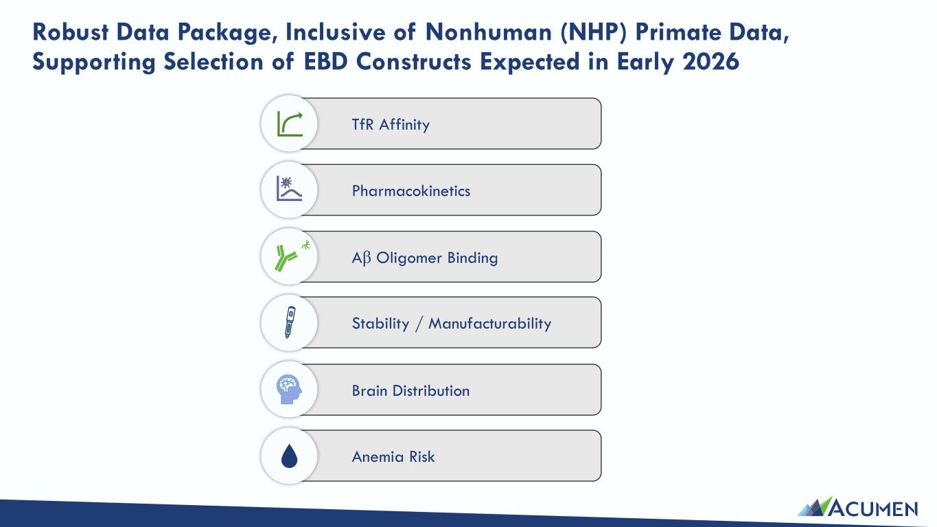 Anemia Risk Robust Data Package, Inclusive of Nonhuman (NHP) Primate Data, Supporting Selection of EBD Constructs Expected in Early 2026 Brain Distribution Stability / Manufacturability Aβ Oligomer Binding Pharmacokinetics TfR Affinity