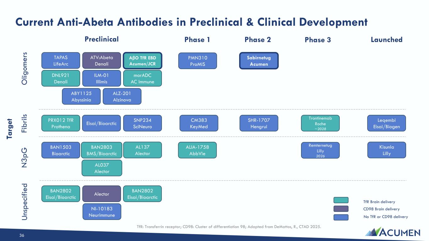 36 Current Anti-Abeta Antibodies in Preclinical & Clinical Development O li g o m e rs T a rg e t Preclinical Phase 1 Phase 2 Phase 3 Launched Sabirnetug Acumen PMN310 ProMIS CM383 KeyMed Trontinemab Roche ~2028 Leqembi Eisai/Biogen Kisunla Lilly Remternetug Lilly 2026 ALIA-1758 AbbVie TAPAS LifeArc ILM-01 Illimis ABY1125 Abyssinia AβO TfR EBD Acumen/JCR ALZ-201 Alzinova morADC AC Immune DNL921 Denali ATV:Abeta Denali BAN2802 Eisai/Bioarctic SNP234 SciNeuro BAN1503 Bioarctic AL137 Alector AL037 Alector Eisai/Bioarctic PRX012 TfR Prothena BAN2803 BMS/Bioarctic TfR Brain delivery Alector CD98 Brain delivery TfR: Transferrin receptor; CD98: Cluster of differentiation 98; Adapted from DeMattos, R., CTAD 2025. Fi b ri ls N 3 p G U n sp e ci fi e d SHR-1707 Hengrui BAN2802 Eisai/Bioarctic NI-10183 Neurimmune No TfR or CD98 delivery