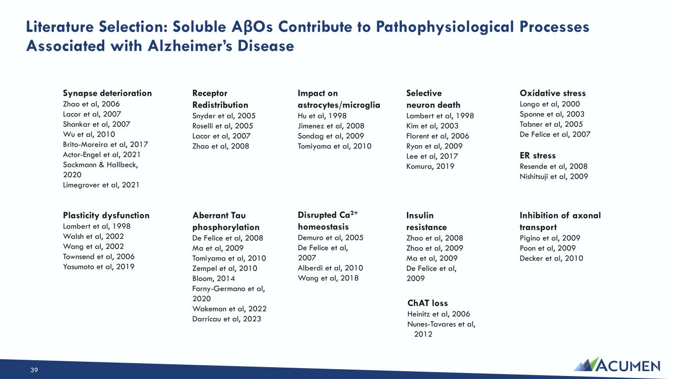 Literature Selection: Soluble AβOs Contribute to Pathophysiological Processes Associated with Alzheimer’s Disease Disrupted Ca2+ homeostasis Demuro et al, 2005 De Felice et al, 2007 Alberdi et al, 2010 Wang et al, 2018 ChAT loss Heinitz et al, 2006 Nunes-Tavares et al, 2012 Inhibition of axonal transport Pigino et al, 2009 Poon et al, 2009 Decker et al, 2010 Oxidative stress Longo et al, 2000 Sponne et al, 2003 Tabner et al, 2005 De Felice et al, 2007 ER stress Resende et al, 2008 Nishitsuji et al, 2009 Insulin resistance Zhao et al, 2008 Zhao et al, 2009 Ma et al, 2009 De Felice et al, 2009 Impact on astrocytes/microglia Hu et al, 1998 Jimenez et al, 2008 Sondag et al, 2009 Tomiyama et al, 2010 Aberrant Tau phosphorylation De Felice et al, 2008 Ma et al, 2009 Tomiyama et al, 2010 Zempel et al, 2010 Bloom, 2014 Forny-Germano et al, 2020 Wakeman et al, 2022 Darricau et al, 2023 Selective neuron death Lambert et al, 1998 Kim et al, 2003 Florent et al, 2006 Ryan et al, 2009 Lee et al, 2017 Komura, 2019 Plasticity dysfunction Lambert et al, 1998 Walsh et al, 2002 Wang et al, 2002 Townsend et al, 2006 Yasumoto et al, 2019 Synapse deterioration Zhao et al, 2006 Lacor et al, 2007 Shankar et al, 2007 Wu et al, 2010 Brito-Moreira et al, 2017 Actor-Engel et al, 2021 Sackmann & Hallbeck, 2020 Limegrover et al, 2021 Receptor Redistribution Snyder et al, 2005 Roselli et al, 2005 Lacor et al, 2007 Zhao et al, 2008 39