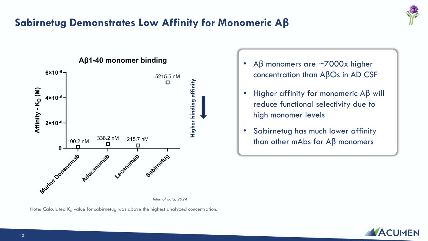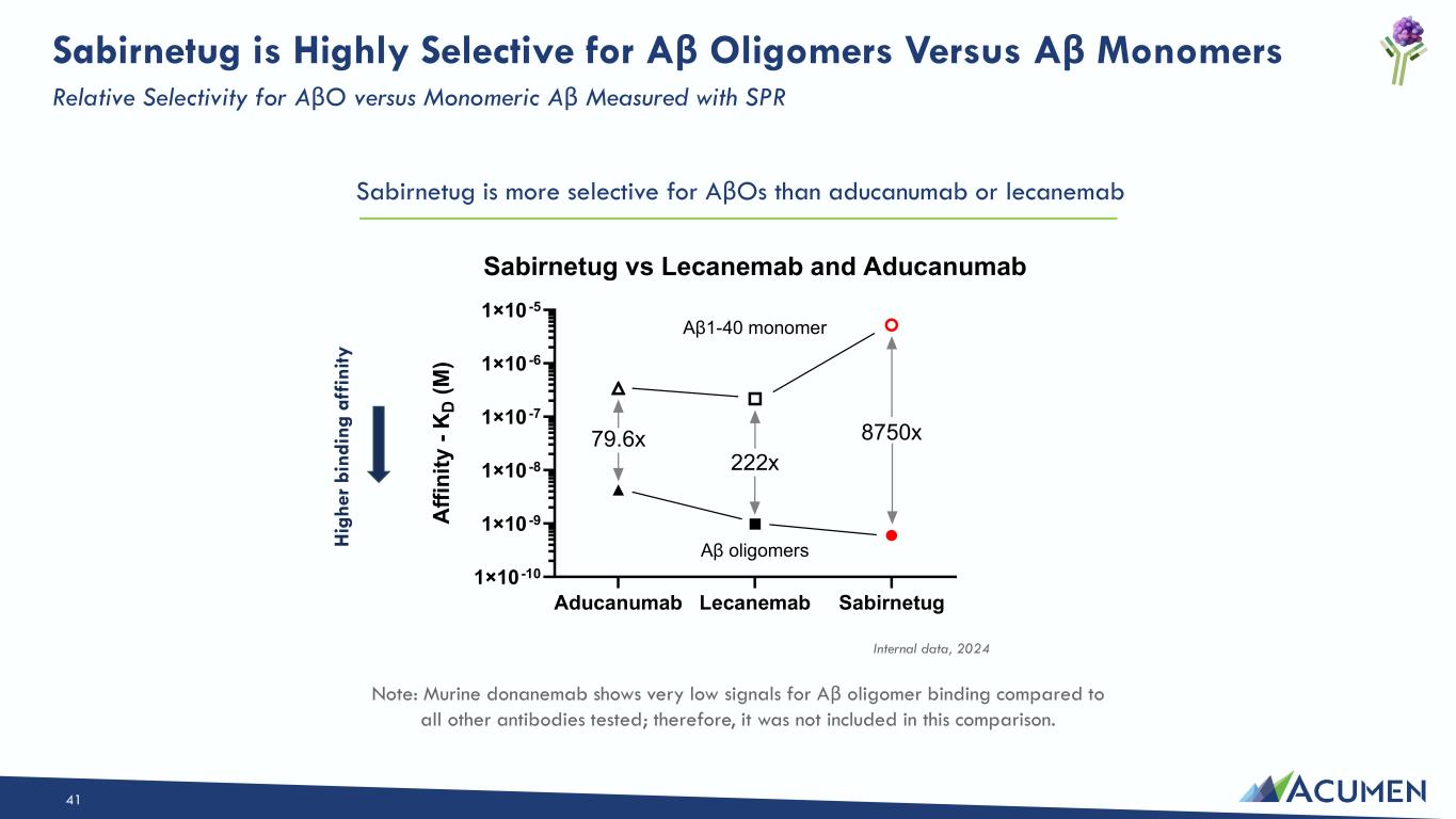 • Aβ monomers are ~7000x higher concentration than AβOs in AD CSF • Higher affinity for monomeric Aβ will reduce functional selectivity due to high monomer levels • Sabirnetug has much lower affinity than other mAbs for Aβ monomers Sabirnetug Demonstrates Low Affinity for Monomeric Aβ 40 M urin e D onan em ab A duca num ab Lec an em ab S ab irn et ug 0 2×10 -6 4×10 -6 6×10 -6 Aβ1-40 monomer binding A ff in it y - K D ( M ) 100.2 nM 338.2 nM 215.7 nM 5215.5 nM H ig h e r b in d in g a ff in it y Internal data, 2024 Note: Calculated KD value for sabirnetug was above the highest analyzed concentration.