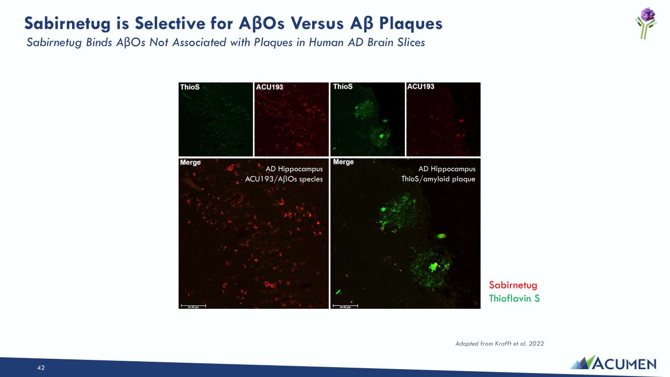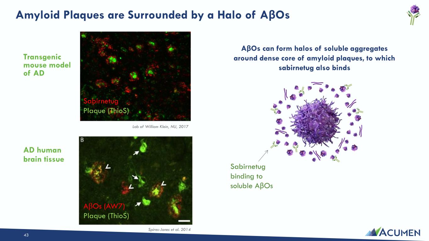 42 AD Hippocampus ThioS/amyloid plaque AD Hippocampus ACU193/AOs species Sabirnetug is Selective for AβOs Versus Aβ Plaques Sabirnetug Thioflavin S Sabirnetug Binds AβOs Not Associated with Plaques in Human AD Brain Slices Adapted from Krafft et al. 2022