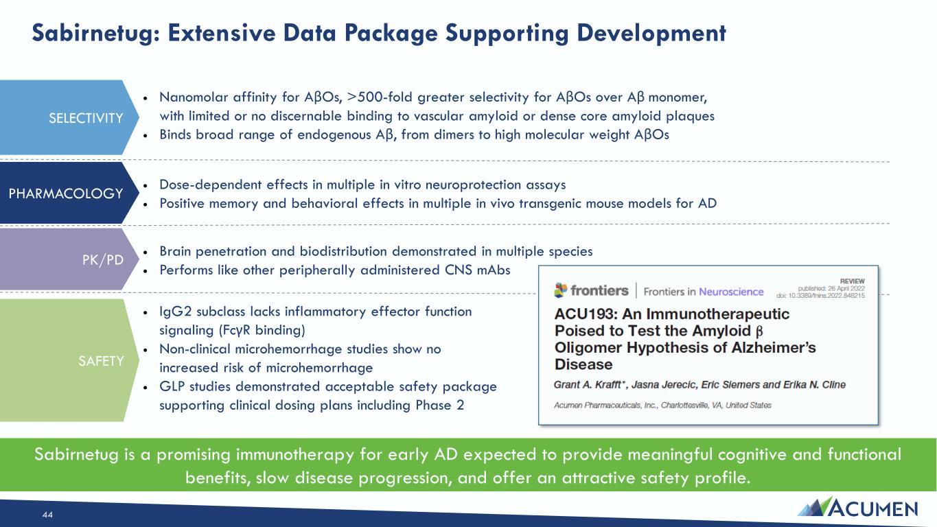 Sabirnetug: Extensive Data Package Supporting Development Sabirnetug is a promising immunotherapy for early AD expected to provide meaningful cognitive and functional benefits, slow disease progression, and offer an attractive safety profile. Nanomolar affinity for AβOs, >500-fold greater selectivity for AβOs over Aβ monomer, with limited or no discernable binding to vascular amyloid or dense core amyloid plaques Binds broad range of endogenous Aβ, from dimers to high molecular weight AβOs Brain penetration and biodistribution demonstrated in multiple species Performs like other peripherally administered CNS mAbs Dose-dependent effects in multiple in vitro neuroprotection assays Positive memory and behavioral effects in multiple in vivo transgenic mouse models for AD IgG2 subclass lacks inflammatory effector function signaling (FcγR binding) Non-clinical microhemorrhage studies show no increased risk of microhemorrhage GLP studies demonstrated acceptable safety package supporting clinical dosing plans including Phase 2 SELECTIVITY PHARMACOLOGY PK/PD SAFETY 44