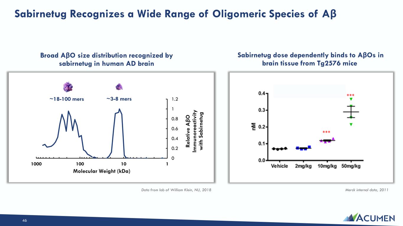 Highly selective for Aβ oligomers versus Aβ monomers Even in the presence of a large excess of Aβ monomer, binding of sabirnetug to AβOs is unchanged Binding of sabirnetug to AβOs >500x binding to Aβ monomer Log [Competing Antigen] μM Sabirnetug Selectivity Sabirnetug Selectivity in presence of 5μM monomeric Aβ ACU193 Log μM Sabirnetug is the First mAb Developed to Selectively Target AβOs Sabirnetug selective for binding to AβOs is preserved even in the presence of a large excess of Aβ monomers – such as what is present in the brain, thus limiting ‘target distraction’ 45