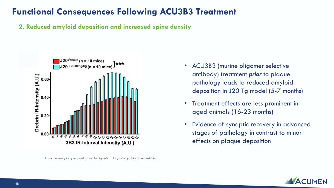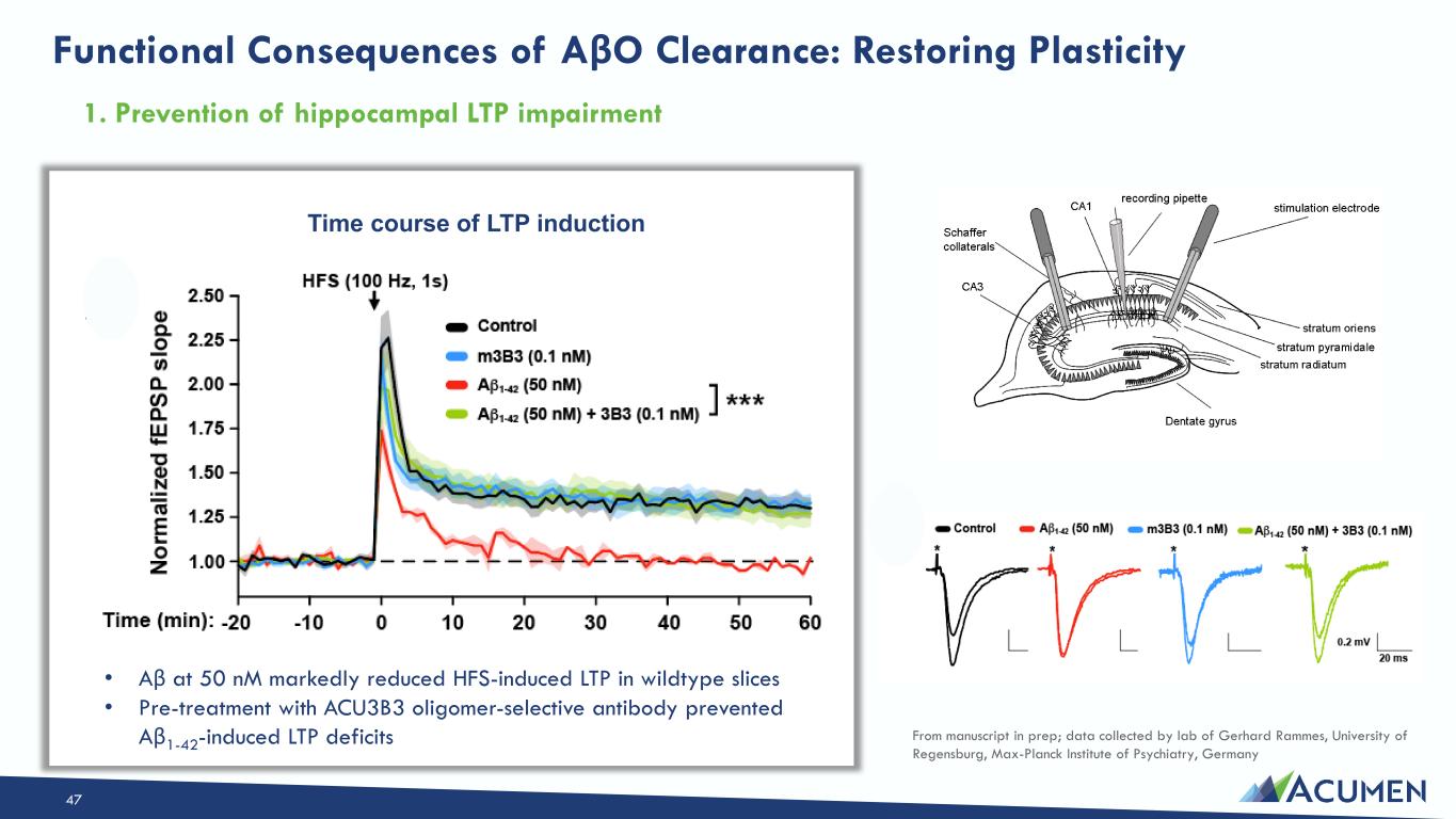 1. Prevention of hippocampal LTP impairment Functional Consequences of AβO Clearance: Restoring Plasticity 47 • Aβ at 50 nM markedly reduced HFS-induced LTP in wildtype slices • Pre-treatment with ACU3B3 oligomer-selective antibody prevented Aβ1-42-induced LTP deficits Time course of LTP induction From manuscript in prep; data collected by lab of Gerhard Rammes, University of Regensburg, Max-Planck Institute of Psychiatry, Germany
