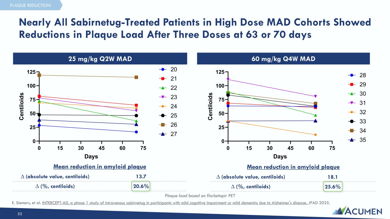 Target Engagement of Sabirnetug with AβOs is Dose Proportional 51 Single Dose Cohorts Multiple Dose Cohorts* 2 mg/kg 10 mg/kg 25 mg/kg 60 mg/kg 0 10 20 30 ACU193 IV Infusion Dose C S F A C U 1 9 3 -A β O li g o m e r C o m p le x ( A U /m L ) a t V is it 8 ( D a y 2 1 ) *One patient from Cohort 5 (10 mg/kg Q4W) excluded because only received one administration of drug (study drug discontinued after lacunar infarct). TARGET ENGAGEMENT p = 0.001 p = 0.03 p = 0.0007No Significant Differences E. Siemers, et al. INTERCEPT-AD, a phase 1 study of intravenous sabirnetug in participants with mild cognitive impairment or mild dementia due to Alzheimer's disease. JPAD 2025.