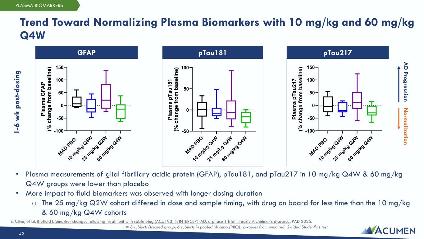 Trend Toward Normalizing Plasma Biomarkers with 10 mg/kg and 60 mg/kg Q4W 55 M A D P B O 10 m g/k g Q 4W 25 m g/k g Q 2W 60 m g/k g Q 4W -100 -50 0 50 100 150 P la s m a G F A P (% c h a n g e f ro m b a s e li n e ) M A D P B O 10 m g/k g Q 4W 25 m g/k g Q 2W 60 m g/k g Q 4W -50 0 50 100 P la s m a p T a u 1 8 1 (% c h a n g e f ro m b a s e li n e ) M A D P B O 10 m g/k g Q 4W 25 m g/k g Q 2W 60 m g/k g Q 4W -100 -50 0 50 100 150 P la s m a p T a u 2 1 7 (% c h a n g e f ro m b a s e li n e ) 1 -6 w k p o st -d o si n g • Plasma measurements of glial fibrillary acidic protein (GFAP), pTau181, and pTau217 in 10 mg/kg Q4W & 60 mg/kg Q4W groups were lower than placebo • More impact to fluid biomarkers was observed with longer dosing duration o The 25 mg/kg Q2W cohort differed in dose and sample timing, with drug on board for less time than the 10 mg/kg & 60 mg/kg Q4W cohorts PLASMA BIOMARKERS pTau181GFAP pTau217 A D P ro g re ssio n N o rm a liz a tio n n = 8 subjects/treated group; 6 subjects in pooled placebo (PBO); p-values from unpaired, 2-sided Student’s t test E. Cline, et al, Biofluid biomarker changes following treatment with sabirnetug (ACU193) in INTERCEPT-AD, a phase 1 trial in early Alzheimer’s disease. JPAD 2025.