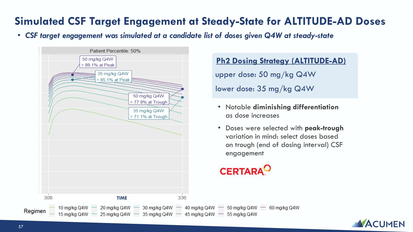 Simulated CSF Target Engagement at Steady-State for ALTITUDE-AD Doses • CSF target engagement was simulated at a candidate list of doses given Q4W at steady-state • Notable diminishing differentiation as dose increases • Doses were selected with peak-trough variation in mind: select doses based on trough (end of dosing interval) CSF engagement upper dose: 50 mg/kg Q4W lower dose: 35 mg/kg Q4W Ph2 Dosing Strategy (ALTITUDE-AD) TIME 57