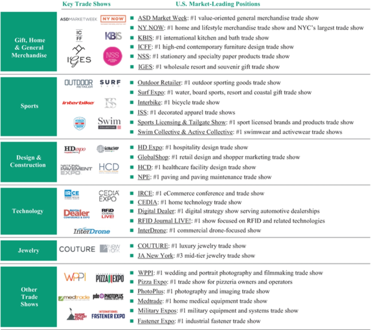 Third-party sources referenced in this prospectus include research and other materials published by: Trade Show Executive (“TSE”), a leading provider of news and tools for trade show managers, which publishes annual lists of the fastest growing trade shows based on net square footage (“NSF”) of paid exhibit space, number of exhibiting companies and number of attendees; Trade Show News Network (“TSNN”), a leading news and online resource for the trade show, exhibition and event industry, which publishes an annual list of the 250 largest trade shows in the United States based on NSF and an annual list of the top 25 events with the fastest growing attendance; and Exhibit Surveys Trade Show Benchmarks and Trends (as of 2015, the last full year for which such data is available). Particular studies referenced include: Center for Exhibition Industry Research (“CEIR”) 2017 Index Report; AMR International Globex Report 2017 (the “AMR Report”); LinkedIn Technology Marketing Research on B2B Lead Generation, 2015 (the last full year for which such data is available); and CEIR: How the Exhibit Dollar is Spent 2017.