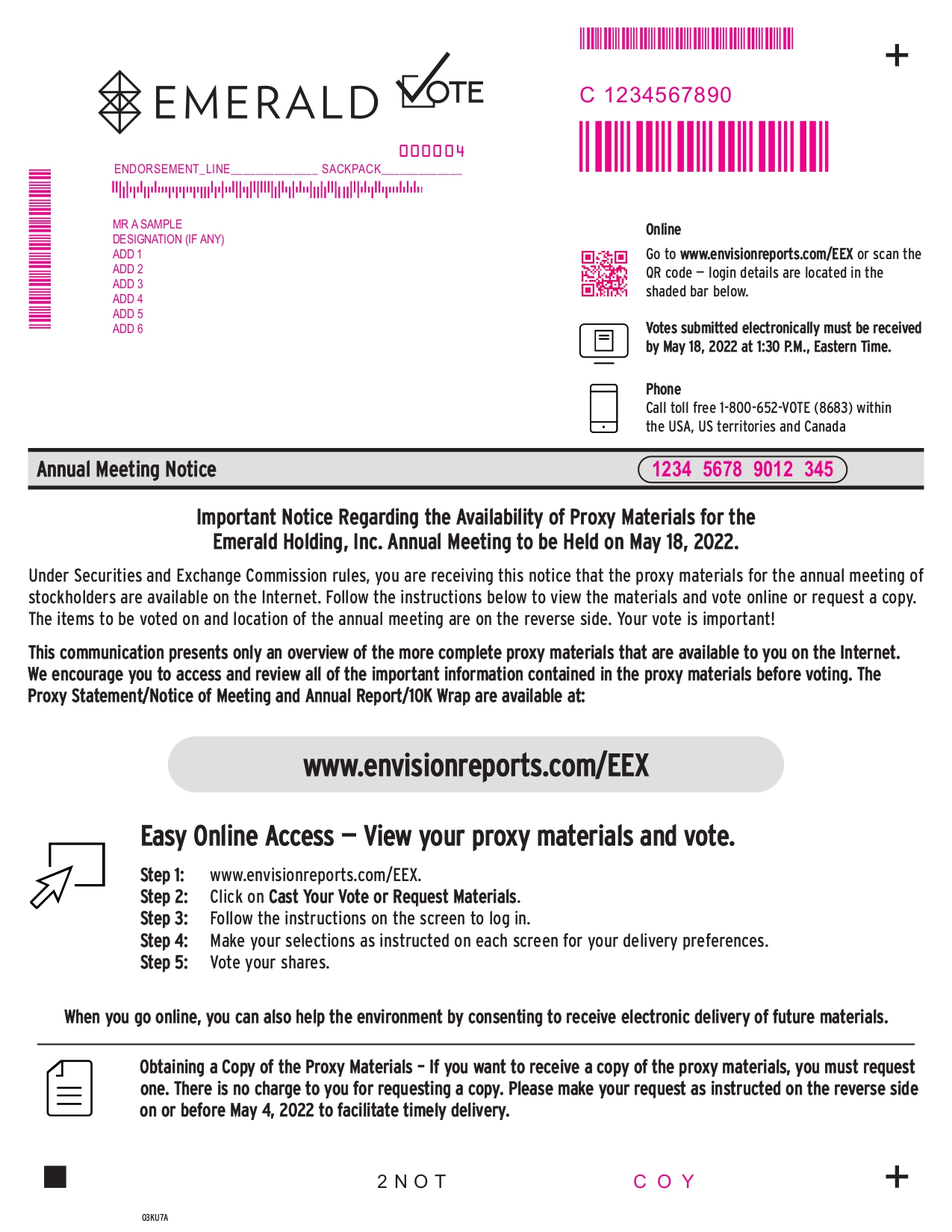Step 1: www.envisionreports.com/EEX. Step 2: Click on Cast Your Vote or Request Materials. Step 3: Follow the instructions on the screen to log in. www.envisionreports.com/EEX Online Go to www.envisionreports.com/EEX or scan the QR code — login details are located in the shaded bar below. Annual Meeting Notice 03KU8A + + Important Notice Regarding the Availability of Proxy Materials for the Emerald Holding, Inc. Annual Meeting to be Held on May 18, 2022. Under Securities and Exchange Commission rules, you are receiving this notice that the proxy materials for the annual meeting of stockholders are available on the Internet. Follow the instructions below to view the materials and vote online or request a copy. The items to be voted on and location of the annual meeting are on the reverse side. Your vote is important! This communication presents only an overview of the more complete proxy materials that are available to you on the Internet. We encourage you to access and review all of the important information contained in the proxy materials before voting. The Proxy Statement/Notice of Meeting and Annual Report/10K Wrap are available at: Obtaining a Copy of the Proxy Materials – If you want to receive a copy of the proxy materials, you must request one. There is no charge to you for requesting a copy. Please make your request as instructed on the reverse side on or before May 4, 2022 to facilitate timely delivery. 2 N O T Easy Online Access — View your proxy materials and vote. When you go online, you can also help the environment by consenting to receive electronic delivery of future materials. Votes submitted electronically must be received by May 18, 2022 at 1:30 P.M., Eastern Time. Step 4: Make your selections as instructed on each screen for your delivery preferences. Step 5: Vote your shares. MMMMMMMMMMMM MMMMMMMMM MR A SAMPLE DESIGNATION (IF ANY) ADD 1 ADD 2 ADD 3 ADD 4 ADD 5 ADD 6 ENDORSEMENT_LINE______________ SACKPACK_____________ 1234 5678 9012 345 C 1234567890 C O Y 000004 MMMMMMM Phone Call toll free 1-800-652-VOTE (8683) within the USA, US territories and Canada