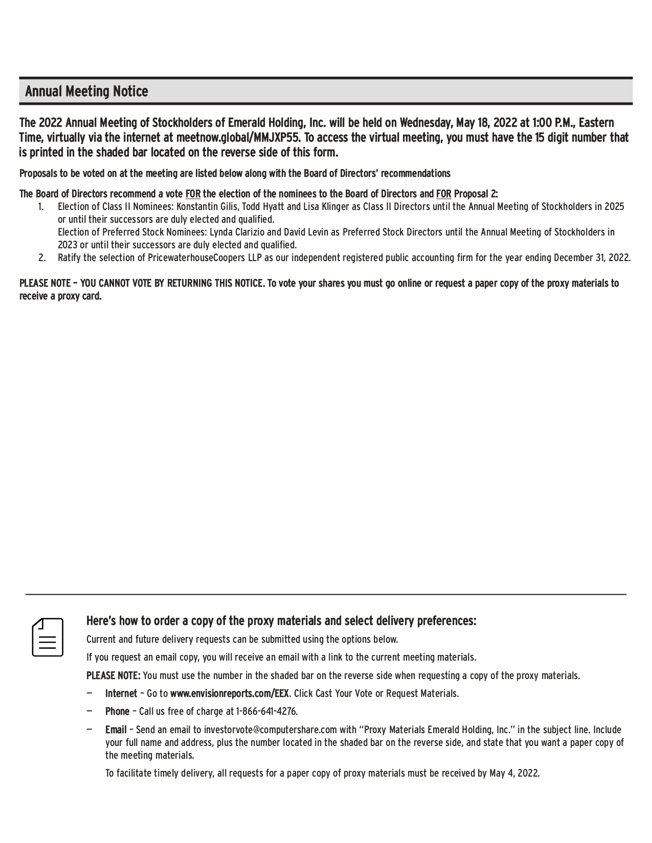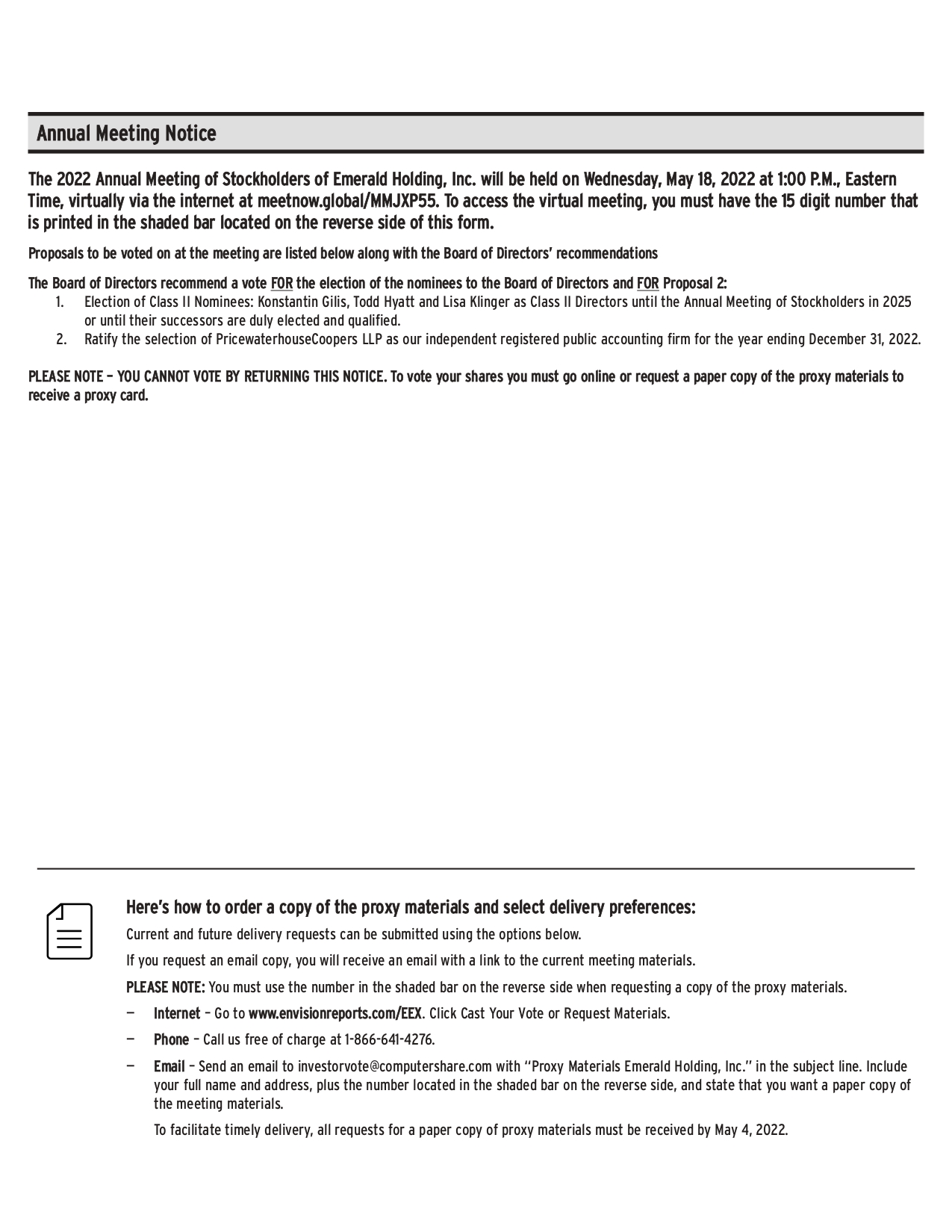 Here’s how to order a copy of the proxy materials and select delivery preferences: Current and future delivery requests can be submitted using the options below. If you request an email copy, you will receive an email with a link to the current meeting materials. PLEASE NOTE: You must use the number in the shaded bar on the reverse side when requesting a copy of the proxy materials. — Internet – Go to www.envisionreports.com/EEX. Click Cast Your Vote or Request Materials. — Phone – Call us free of charge at 1-866-641-4276. — Email – Send an email to investorvote@computershare.com with “Proxy Materials Emerald Holding, Inc.” in the subject line. Include your full name and address, plus the number located in the shaded bar on the reverse side, and state that you want a paper copy of the meeting materials. To facilitate timely delivery, all requests for a paper copy of proxy materials must be received by May 4, 2022. The 2022 Annual Meeting of Stockholders of Emerald Holding, Inc. will be held on Wednesday, May 18, 2022 at 1:00 P.M., Eastern Time, virtually via the internet at meetnow.global/MMJXP55. To access the virtual meeting, you must have the 15 digit number that is printed in the shaded bar located on the reverse side of this form. Proposals to be voted on at the meeting are listed below along with the Board of Directors’ recommendations The Board of Directors recommend a vote FOR the election of the nominees to the Board of Directors and FOR Proposal 2: 1. Election of Class II Nominees: Konstantin Gilis, Todd Hyatt and Lisa Klinger as Class II Directors until the Annual Meeting of Stockholders in 2025 or until their successors are duly elected and qualified. Election of Preferred Stock Nominees: Lynda Clarizio and David Levin as Preferred Stock Directors until the Annual Meeting of Stockholders in 2023 or until their successors are duly elected and qualified. 2. Ratify the selection of PricewaterhouseCoopers LLP as our independent registered public accounting firm for the year ending December 31, 2022. PLEASE NOTE – YOU CANNOT VOTE BY RETURNING THIS NOTICE. To vote your shares you must go online or request a paper copy of the proxy materials to receive a proxy card. Annual Meeting Notice