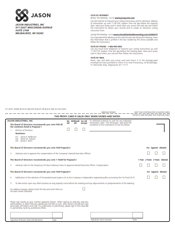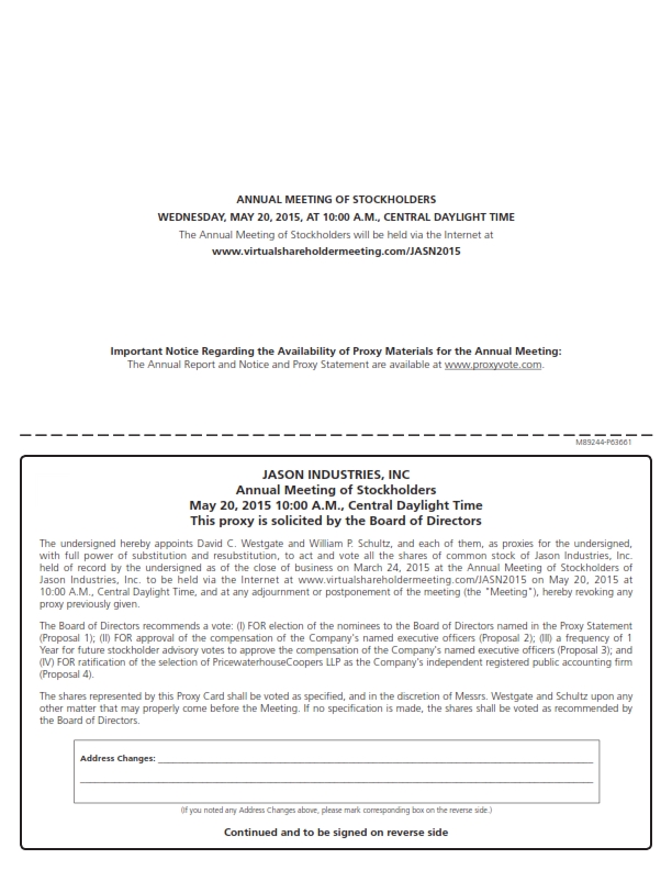 On behalf of the Board of Directors and management of Jason Industries, Inc., we cordially invite you to attend the 2015 Annual Meeting of Stockholders, which will be held as a virtual meeting at 10:00 a.m., Central Daylight Time, on Wednesday, May 20, 2015. You may attend the Annual Meeting, vote and submit a question during the meeting by visiting http://www.virtualshareholdermeeting.com/JASN2015. You will need to provide your control number found on your proxy card.