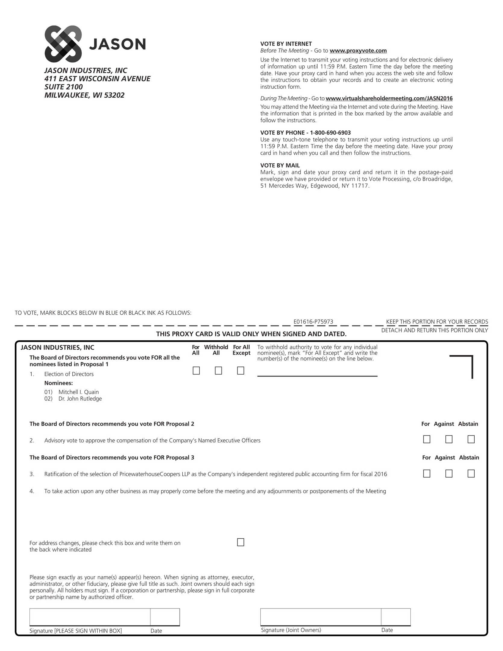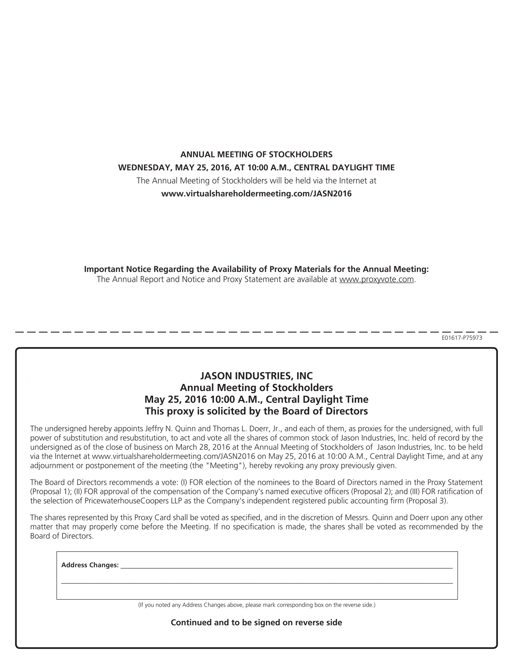 On behalf of the Board of Directors and management of Jason Industries, Inc., we cordially invite you to attend the 2016 Annual Meeting of Stockholders, which will be held as a virtual meeting at 10:00 a.m., Central Daylight Time, on Wednesday, May 25, 2016. You may attend the Annual Meeting, vote and submit a question during the meeting by visiting http://www.virtualshareholdermeeting.com/JASN2016. You will need to provide your control number found on your proxy card.