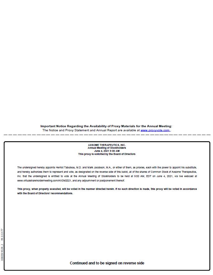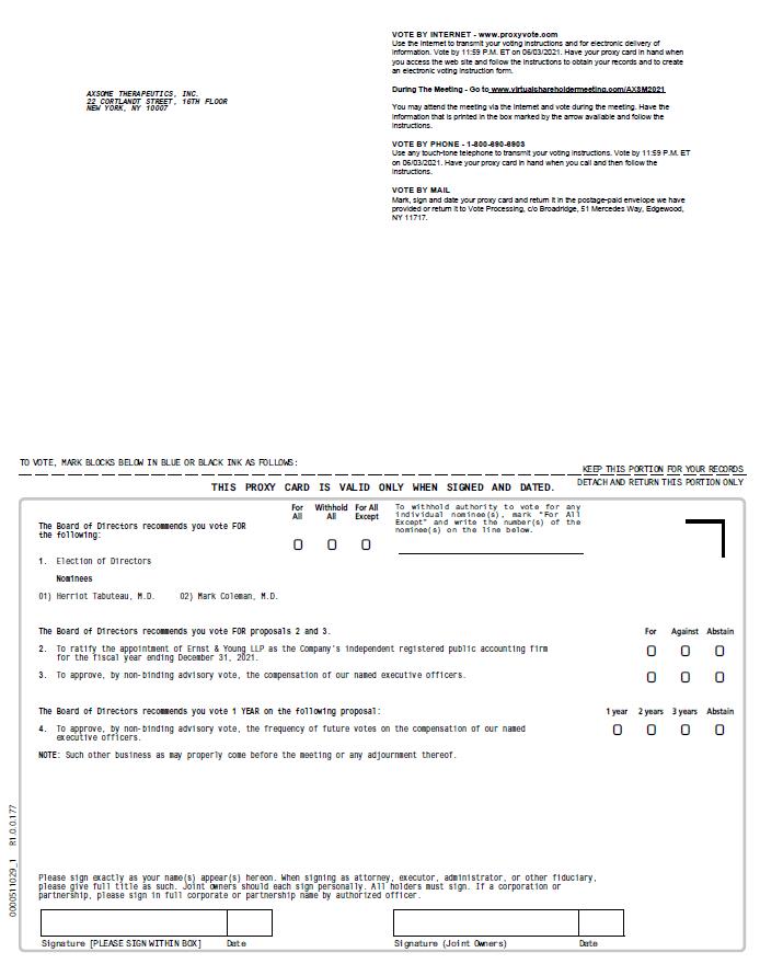 Important Notice Regarding the Availability of Proxy Materials for the Annual Meeting: The Notice and Proxy Statement and Annual Report are available at www.proxyvote.com . AXSOME THERAPEUTICS, INC. Annual Meeting of Stockholders June 4, 2021 9:00 AM This proxy is solicited by the Board of Directors The undersigned hereby appoints Herriot Tabuteau, M.D. and Mark Jacobson, M.A., or either of them, as proxies, each with the power to appoint his substitute, and hereby authorizes them to represent and vote, as designated on the reverse side of this ballot, all of the shares of Common Stock of Axsome Therapeutics, Inc. that the undersigned is entitled to vote at the Annual Meeting of Stockholders to be held at 9:00 AM, EDT on June 4, 2021, via live webcast at www.virtualshareholdermeeting.com/AXSM2021, and any adjournment or postponement thereof. This proxy, when properly executed, will be voted in the manner directed herein. If no such direction is made, this proxy will be voted in accordance with the Board of Directors' recommendations. Continued and to be signed on reverse side 0000511029_2 R1.0.0.177