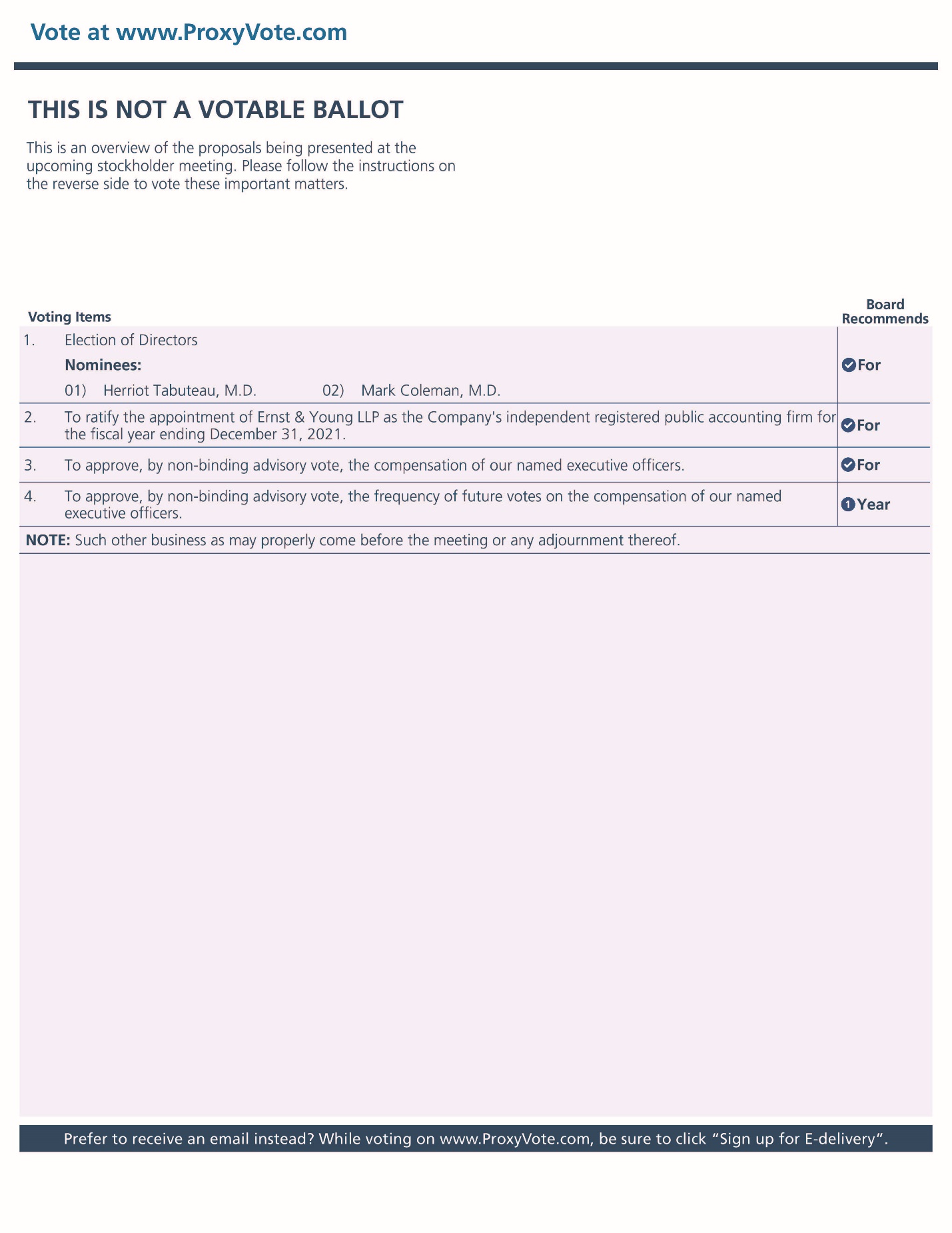Vote at www.ProxyVote.com THIS IS NOT A VOTABLE BALLOT This is an overview of the proposals being presented at the upcoming stockholder meeting. Please follow the instructions on the reverse side to vote these important matters. Voting Items Board Recommends 1. Election of Directors Nominees: 01) Herriot Tabuteau, M.D. 02) Mark Coleman, M.D. 0For 2. To ratify the appointment of Ernst & Young LLP as the Company's independent registered public accounting firm for the fiscal year ending December 31, 2021. OF or 3. To approve, by non-binding advisory vote, the compensation of our named executive officers. 0For 4. To approve, by non-binding advisory vote, the frequency of future votes on the compensation of our named executive officers. 0Year NOTE: Such other business as may properly come before the meeting or any adjournment thereof. Prefer to receive an email instead? While voting on www.ProxyVote.com, be sure to click "Sign up for E-delivery".