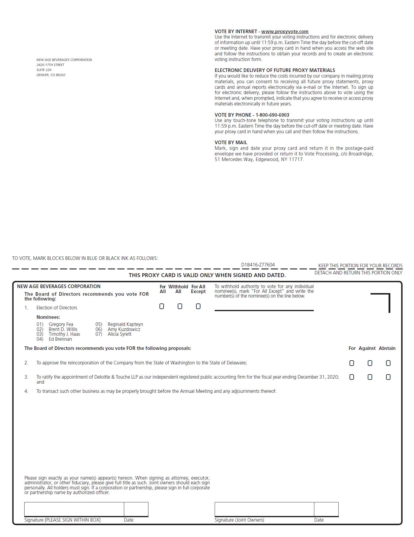 If you have questions about voting your shares, please contact our Corporate Secretary of New Age Beverages Corporation at 2420 17th Street, Suite 220, Denver, CO 80202, or at telephone number (303) 566-3030.