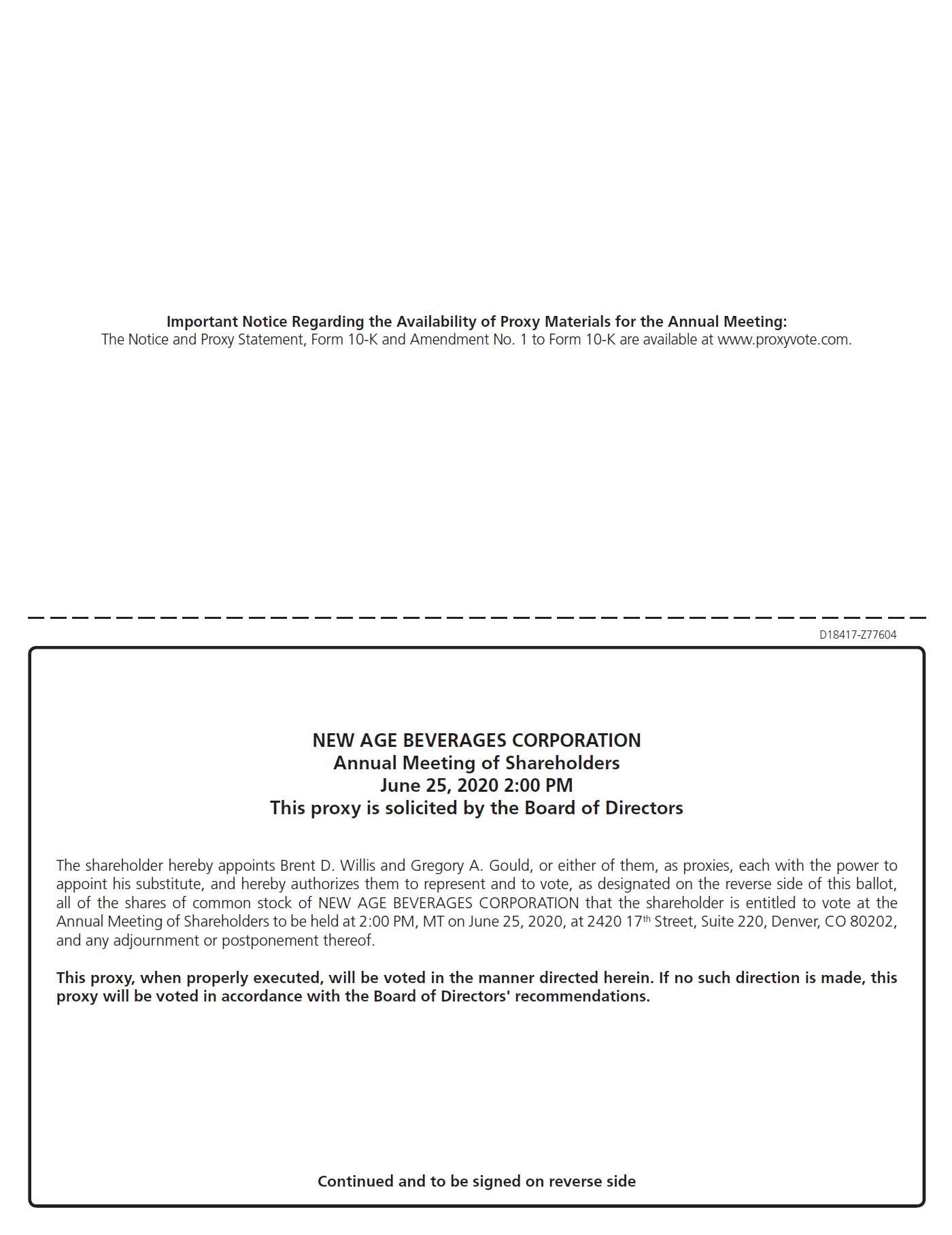 NOTICE IS HEREBY GIVEN that the 2020 Annual Meeting of Shareholders (the “Annual Meeting”) of New Age Beverages Corporation, a Washington corporation (the “Company”), will be held at 2:00 p.m. MT on June 25, 2020, or such later date or dates as such Annual Meeting date may be adjourned, at 2420 17th Street, Suite 220, Denver, CO 80202, for the purpose of considering and taking action on the following proposals:
