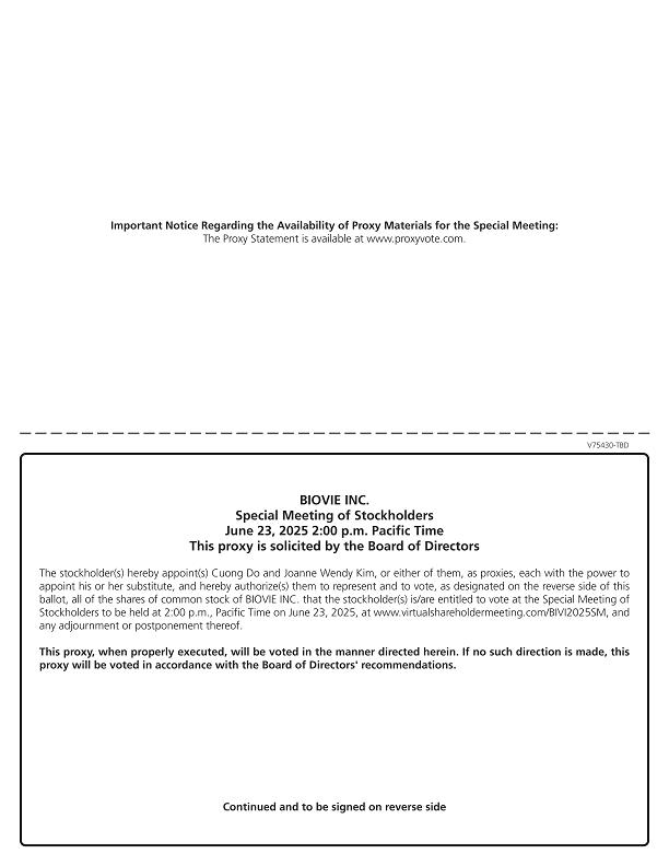 You are invited to participate in a special meeting (the “Special Meeting”) of stockholders of BioVie Inc., a Nevada corporation (“BioVie” or the “Company”), to be held on Monday, June 23, 2025 at 2:00 p.m. Pacific Time. The Company’s Board of Directors (“Board of Directors) has determined to convene and conduct the Special Meeting in a virtual meeting format at www.virtualshareholdermeeting.com/BIVI2025SM. Stockholders will NOT be able to attend the Special Meeting in-person. The accompanying Proxy Statement includes instruction on how to access the virtual Special Meeting and how to listen, vote, and submit questions from home or any remote location with Internet connectivity. At the Special Meeting, we will consider and vote upon the following items:
