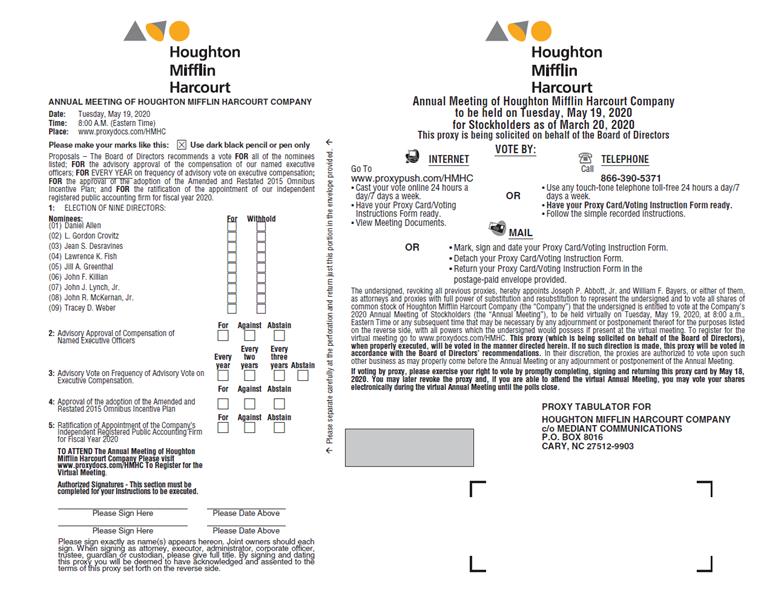 ANNUAL MEETING OF HOUGHTON MIFFLIN HARCOURT COMPANY Date: Tuesday, May 19, 2020 Time: 8:00 A.M. (Eastern Time) Place: www.proxydocs.com/HMHC Please make your marks like this: È Use dark black pencil or pen only Proposals – The Board of Directors recommends a vote FOR all of the nominees listed; FOR the advisory approval of the compensation of our named executive officers; FOR EVERY YEAR on frequency of advisory vote on executive compensation; FOR the approval of the adoption of the Amended and Restated 2015 Omnibus Incentive Plan; and FOR the ratification of the appointment of our independent registered public accounting firm for fiscal year 2020. 1: ELECTION OF NINE DIRECTORS: Nominees: For Withhold (01) Daniel Allen ‘ ‘ (02) L. Gordon Crovitz ‘ ‘ (03) Jean S. Desravines ‘ ‘ (04) Lawrence K. Fish ‘ ‘ (05) Jill A. Greenthal ‘ ‘ (06) John F. Killian ‘ ‘ (07) John J. Lynch, Jr. ‘ ‘ (08) John R. McKernan, Jr. ‘ ‘ (09) Tracey D. Weber ‘ ‘ For Against Abstain 2: Advisory Approval of Compensation of Named Executive Officers ‘ ‘ ‘ Every year Every two years Every three years Abstain 3: Advisory Vote on Frequency of Advisory Vote on Executive Compensation. ‘ ‘ ‘ ‘ For Against Abstain 4: Approval of the adoption of the Amended and Restated 2015 Omnibus Incentive Plan ‘ ‘ ‘ For Against Abstain 5: Ratification of Appointment of the Company’s Independent Registered Public Accounting Firm for Fiscal Year 2020 ‘ ‘ ‘ TO ATTEND The Annual Meeting of Houghton Mifflin Harcourt Company Please visit www.proxydocs.com/HMHC To Register for the Virtual Meeting. Authorized Signatures - This section must be completed for your Instructions to be executed. Please Sign Here Please Date Above Please Sign Here Please Date Above Please sign exactly as name(s) appears hereon. Joint owners should each sign. When signing as attorney, executor, administrator, corporate officer, trustee, guardian or custodian, please give full title. By signing and dating this proxy you will be deemed to have acknowledged and assented to the terms of this proxy set forth on the reverse side. Please separate carefully at the perforation and return just this portion in the envelope provided. Annual Meeting of Houghton Mifflin Harcourt Company to be held on Tuesday, May 19, 2020 for Stockholders as of March 20, 2020 This proxy is being solicited on behalf of the Board of Directors VOTE BY: INTERNET TELEPHONE Go To Call www.proxypush.com/HMHC 866-390-5371 • Cast your vote online 24 hours a day/7 days a week. OR • Use any touch-tone telephone toll-free 24 hours a day/7 days a week. • Have your Proxy Card/Voting Instructions Form ready. •• Have your Proxy Card/Voting Instruction Form ready. Follow the simple recorded instructions. • View Meeting Documents. MAIL OR • Mark, sign and date your Proxy Card/Voting Instruction Form. • Detach your Proxy Card/Voting Instruction Form. • Return your Proxy Card/Voting Instruction Form in the postage-paid envelope provided. The undersigned, revoking all previous proxies, hereby appoints Joseph P. Abbott, Jr. and William F. Bayers, or either of them, as attorneys and proxies with full power of substitution and resubstitution to represent the undersigned and to vote all shares of common stock of Houghton Mifflin Harcourt Company (the “Company”) that the undersigned is entitled to vote at the Company’s 2020 Annual Meeting of Stockholders (the “Annual Meeting”), to be held virtually on Tuesday, May 19, 2020, at 8:00 a.m., Eastern Time or any subsequent time that may be necessary by any adjournment or postponement thereof for the purposes listed on the reverse side, with all powers which the undersigned would possess if present at the virtual meeting. To register for the virtual meeting go to www.proxydocs.com/HMHC. This proxy (which is being solicited on behalf of the Board of Directors), when properly executed, will be voted in the manner directed herein. If no such direction is made, this proxy will be voted in accordance with the Board of Directors’ recommendations. In their discretion, the proxies are authorized to vote upon such other business as may properly come before the Annual Meeting or any adjournment or postponement of the Annual Meeting. If voting by proxy, please exercise your right to vote by promptly completing, signing and returning this proxy card by May 18, 2020. You may later revoke the proxy and, if you are able to attend the virtual Annual Meeting, you may vote your shares electronically during the virtual Annual Meeting until the polls close. PROXY TABULATOR FOR HOUGHTON MIFFLIN HARCOURT COMPANY c/o MEDIANT COMMUNICATIONS P.O. BOX 8016 CARY, NC 27512-9903 Houghton Mifflin Harcourt