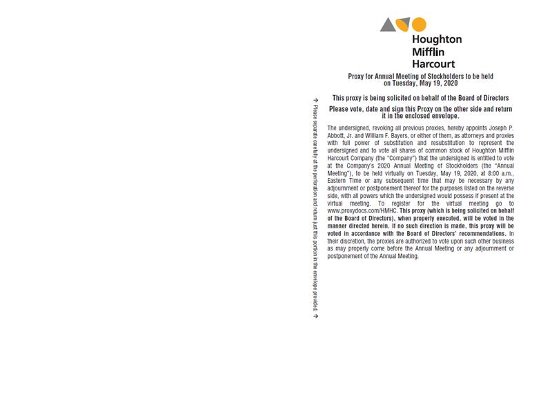 Please separate carefully at the perforation and return just this portion in the envelope provided. Proxy for Annual Meeting of Stockholders to be held on Tuesday, May 19, 2020 This proxy is being solicited on behalf of the Board of Directors Please vote, date and sign this Proxy on the other side and return it in the enclosed envelope. The undersigned, revoking all previous proxies, hereby appoints Joseph P. Abbott, Jr. and William F. Bayers, or either of them, as attorneys and proxies with full power of substitution and resubstitution to represent the undersigned and to vote all shares of common stock of Houghton Mifflin Harcourt Company (the “Company”) that the undersigned is entitled to vote at the Company’s 2020 Annual Meeting of Stockholders (the “Annual Meeting”), to be held virtually on Tuesday, May 19, 2020, at 8:00 a.m., Eastern Time or any subsequent time that may be necessary by any adjournment or postponement thereof for the purposes listed on the reverse side, with all powers which the undersigned would possess if present at the virtual meeting. To register for the virtual meeting go to www.proxydocs.com/HMHC. This proxy (which is being solicited on behalf of the Board of Directors), when properly executed, will be voted in the manner directed herein. If no such direction is made, this proxy will be voted in accordance with the Board of Directors’ recommendations. In their discretion, the proxies are authorized to vote upon such other business as may properly come before the Annual Meeting or any adjournment or postponement of the Annual Meeting. Houghton Mifflin Harcourt