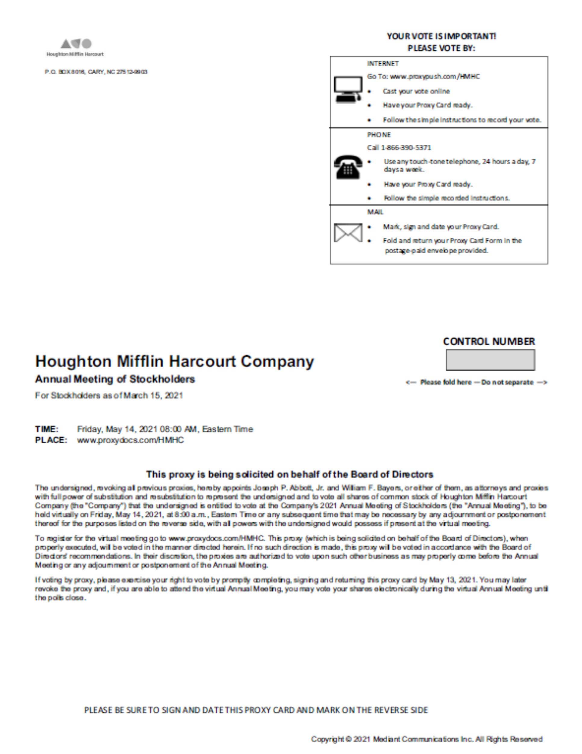 Houghton Mifflin Harcourt P.O. BOX 8016, CARY, NC 27512-9903 YOUR VOTE IS IMPORTANT! PLEASE VOTE BY: INTERNET Go To: www.proxypush.com/HMHC Cast your vote online Have your Proxy Card ready. Follow the simple instructions to record your vote. PHONE Call 1-866-390-5371 Use any touch-tone telephone, 24 hours a day, 7 days a week. Have your Proxy Card ready. Follow the simple recorded instructions. MAIL Mark, sign and date your Proxy Card. Fold and return your Proxy Card Form in the postage-paid envelope provided. CONTROL NUMBER Houghton Mifflin Harcourt Company Annual Meeting of Stockholders For Stockholders as of March 15, 2021 <— Please fold here — Do not separate —> TIME: Friday, May 14, 2021 08:00 AM, Eastern Time PLACE: www.proxydocs.com/HMHC This proxy is being solicited on behalf of the Board of Directors The undersigned, revoking all previous proxies, hereby appoints Joseph P. Abbott, Jr. and William F. Bayers, or either of them, as attorneys and proxies with full power of substitution and resubstitution to represent the undersigned and to vote all shares of common stock of Houghton Mifflin Harcourt Company (the "Company") that the undersigned is entitled to vote at the Company's 2021 Annual Meeting of Stockholders (the "Annual Meeting"), to be held virtually on Friday, May 14, 2021, at 8:00 a.m., Eastern Time or any subsequent time that may be necessary by any adjournment or postponement thereof for the purposes listed on the reverse side, with all powers with the undersigned would possess if present at the virtual meeting. To register for the virtual meeting go to www.proxydocs.com/HMHC. This proxy (which is being solicited on behalf of the Board of Directors), when properly executed, will be voted in the manner directed herein. If no such direction is made, this proxy will be voted in accordance with the Board of Directors' recommendations. In their discretion, the proxies are authorized to vote upon such other business as may properly come before the Annual Meeting or any adjournment or postponement of the Annual Meeting. If voting by proxy, please exercise your right to vote by promptly completing, signing and returning this proxy card by May 13, 2021. You may later revoke the proxy and, if you are able to attend the virtual Annual Meeting, you may vote your shares electronically during the virtual Annual Meeting until the polls close. PLEASE BE SURE TO SIGN AND DATE THIS PROXY CARD AND MARK ON THE REVERSE SIDE Copyright © 2021 Mediant Communications Inc. All Rights Reserved