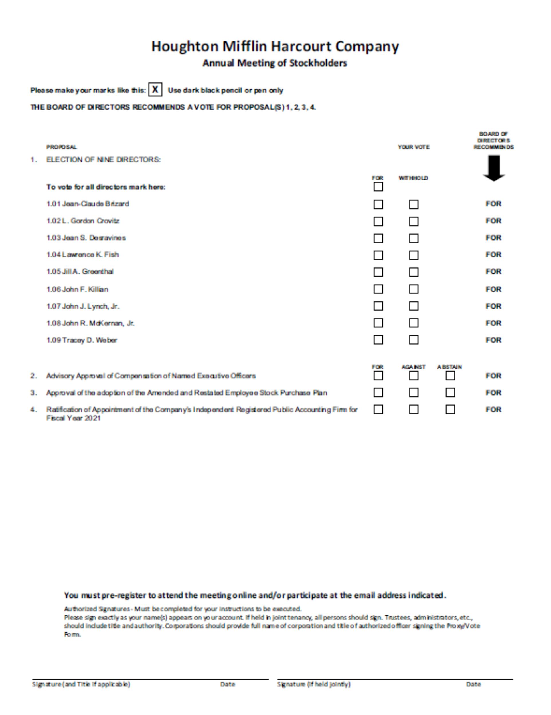 Houghton Mifflin Harcourt Company Annual Meeting of Stockholders Please make your marks like this: X Use dark black pencil or pen only THE BOARD OF DIRECTORS RECOMMENDS A VOTE FOR PROPOSAL(S) 1, 2, 3, 4. PROPOSAL YOUR VOTE BOARD OF DIRECTORS RECOMMENDS 1. ELECTION OF NINE DIRECTORS: FOR WITHHOLD To vote for all directors mark here: 1.01 Jean-Claude Brizard FOR 1.02 L. Gordon Crovitz FOR 1.03 Jean S. Desravines FOR 1.04 Lawrence K. Fish FOR 1.05 Jill A. Greenthal FOR 1.06 John F. Killian FOR 1.07 John J. Lynch, Jr. FOR 1.08 John R. McKernan, Jr. FOR 1.09 Tracey D. Weber FOR FOR AGAINST ABSTAIN 2. Advisory Approval of Compensation of Named Executive Officers FOR 3. Approval of the adoption of the Amended and Restated Employee Stock Purchase Plan FOR 4. Ratification of Appointment of the Company’s Independent Registered Public Accounting Firm for Fiscal Year 2021 FOR You must pre-register to attend the meeting online and/or participate at the email address indicated. Authorized Signatures - Must be completed for your instructions to be executed. Please sign exactly as your name(s) appears on your account. If held in joint tenancy, all persons should sign. Trustees, administrators, etc., should include title and authority. Corporations should provide full name of corporation and title of authorized officer signing the Proxy/Vote Form. Signature (and Title if applicable) Date Signature (if held jointly) Date