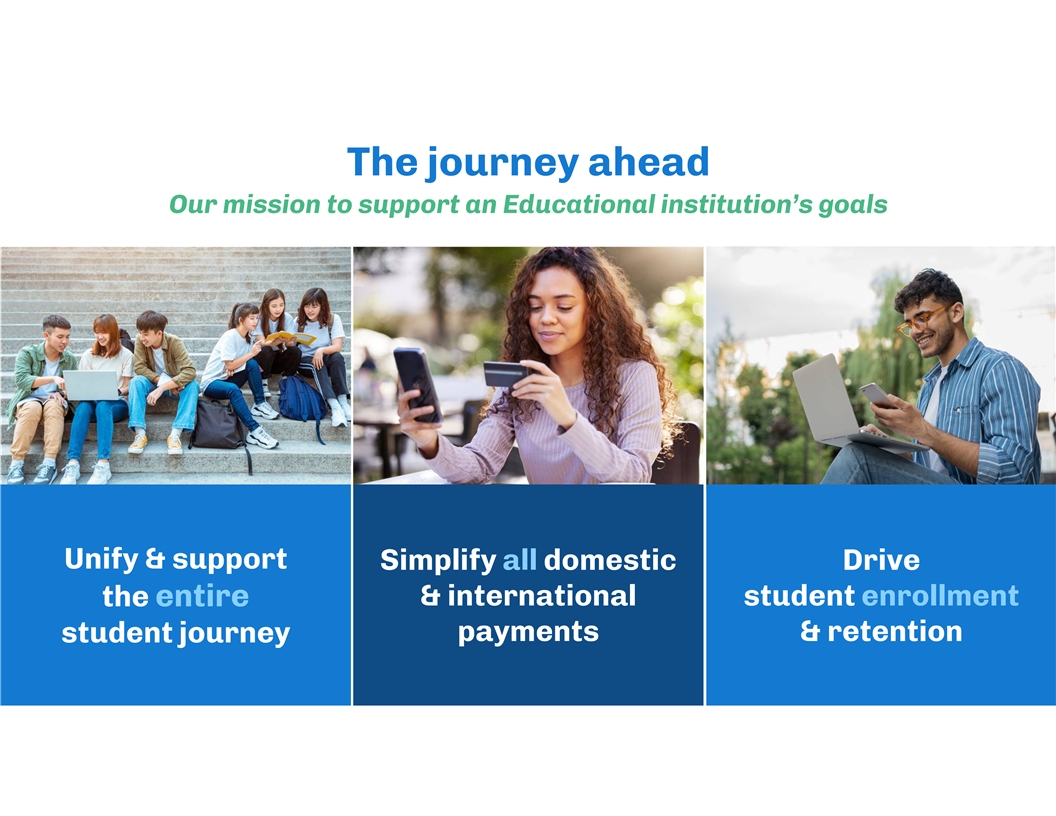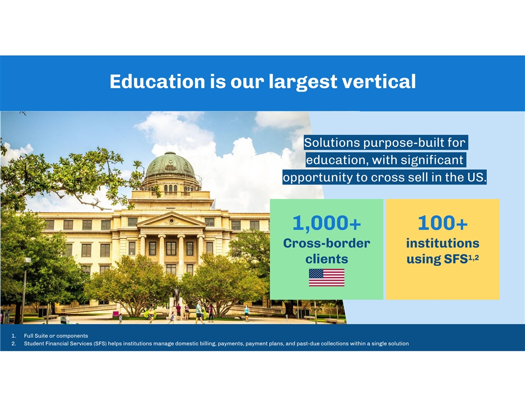 Education is our largest vertical Solutions purpose-built for education, with significant opportunity to cross sell in the US. 1,000+ 100+ Cross-border institutions 1,2 clients using SFS 1. Full Suite or components 2. Student Financial Services (SFS) helps institutions manage domestic billing, payments, payment plans, and past-due collections within a single solution