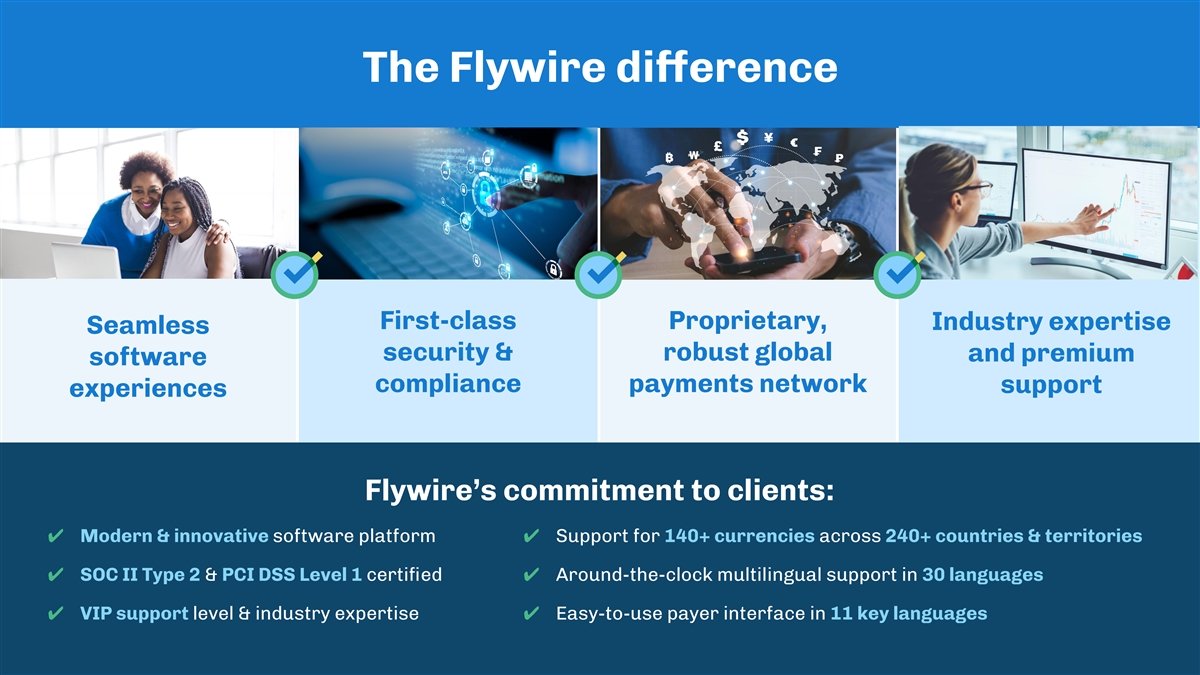 The Flywire difference First-class Proprietary, Industry expertise Seamless security & robust global and premium software compliance payments network support experiences Flywire’s commitment to clients: ✔ Modern & innovative software platform✔ Support for 140+ currencies across 240+ countries & territories ✔ SOC II Type 2 & PCI DSS Level 1 certified ✔ Around-the-clock multilingual support in 30 languages ✔ VIP support level & industry expertise✔ Easy-to-use payer interface in 11 key languages
