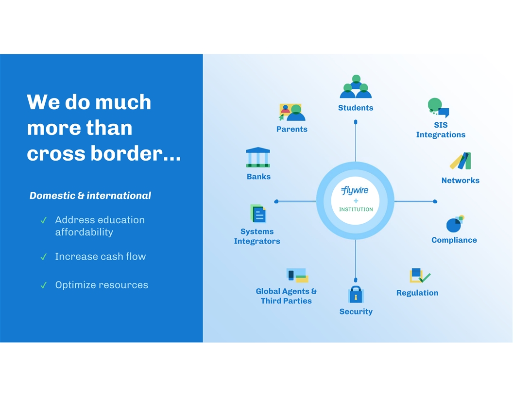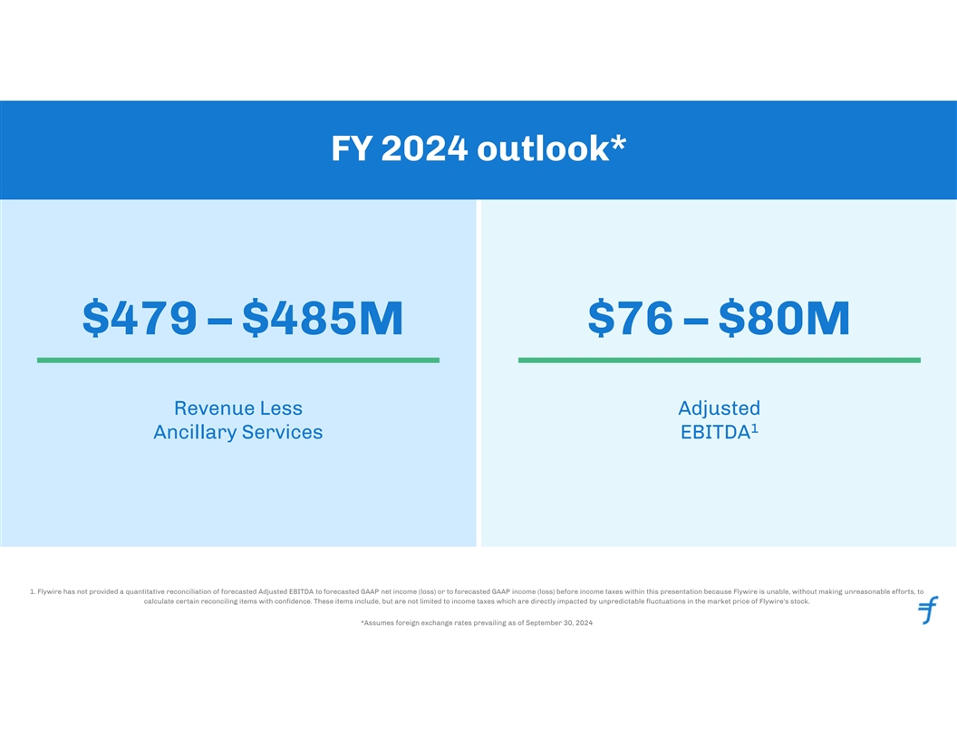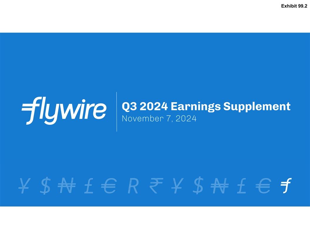 Disclosures This presentation includes forward-looking statements within the meaning of the Private Securities Litigation Reform Act of 1995 and Section 21E of the Securities Exchange Act of 1934, as amended. All statements other than statements of historical facts contained in this presentation, including statements regarding Flywire’s ability to successfully implement Flywire’s business plan, future results of operations and financial position, business strategy and plans and Flywire’s objectives for future operations, are forward -looking statements. The words “believe,” “may,” “will,” “estimate,” “continue,” “anticipate,” “intend,” “expect,” “plans,” “potential,” “seeks,” “projects,” “should,” “could” and “would” and similar expressions are intended to identify forward -looking statements, although not all forward-looking statements contain these identifying words. Flywire has based these forward-looking statements largely on Flywire’s current expectations and projections about future events and financial trends that Flywire believes may affect Flywire’s financial condition, results of operations, business strategy, short-term and long-term business operations and objectives, and financial needs. These forward-looking statements are subject to a number of risks, uncertainties and assumptions that are described in the Risk Factors and Management's Discussion and Analysis of Financial Condition and Results of Operations sections of Flywire's Annual Report on Form 10-K for the year ended December 31, 2023, and Quarterly Report on Form 10-Q for the quarter ended June 30, 2024, which are on file with the Securities and Exchange Commission (SEC) and available on the SEC's website at www.sec.gov. Additional factors may be described in those sections of Flywire's Quarterly Report on Form 10-Q for the quarter ended September 30, 2024, expected to be filed with the SEC in the fourth quarter of 2024. In light of these risks, uncertainties and assumptions, the forward -looking events and circumstances discussed in this presentation may not occur and actual results could differ materially and adversely from those anticipated or implied in the forward-looking statements. You should not rely upon forward-looking statements as predictions of future events or performance. In addition, projections, assumptions and estimates of the future performance of the industries in which Flywire operates and the markets it serves are inherently imprecise and subject to a high degree of uncertainty and risk. All financial projections contained in this presentation are forward -looking statements and are based on Flywire’s management’s assessment of such matters. It is unlikely, however, that the assumptions on which Flywire has based its projections will prove to be fully correct or that the projected figures will be attained. Flywire’s actual future results may differ materially from Flywire’s projections, and it makes no express or implied representation or warranty as to attainability of the results reflected in these projections. Investments in Flywire’s securities involve a high degree of risk and should be regarded as speculative. Certain information contained in this presentation, including Flywire’s estimated Total Addressable Market (TAM), relates to or is based on studies, publications, surveys and other data obtained from third-party sources and Flywire’s own internal estimates and research. While Flywire believes these third-party sources to be reliable as of the date of this presentation, it has not independently verified, and makes no representation as to the adequacy, fairness, accuracy or completeness of any information obtained from third-party sources. In addition, all of the market data included in this presentation involves a number of assumptions and limitations, and there can be no guarantee as to the accuracy or reliability of such assumptions. Finally, while Flywire believes its own internal research is reliable, such research has not been verified by any independent source. The information in this presentation is provided only as of November 7, 2024, and Flywire undertakes no obligation to update any forward-looking statements contained in this presentation on account of new information, future events, or otherwise, except as required by law. This presentation contains certain non-GAAP financial measures as defined by SEC rules. Flywire has provided a reconciliation of those measures to the most directly comparable GAAP measures, which is available in the Appendix. The company has not provided a quantitative reconciliation from forecasted adjusted EBITDA to forecasted GAAP net income (loss) or to forecasted GAAP income (loss) before income taxes, because it is unable without making unreasonable efforts, to calculate certain reconciling items with confidence. These items include but are not limited to income taxes which are directly impacted by unpredictable fluctuations in the market price of the company's stock.