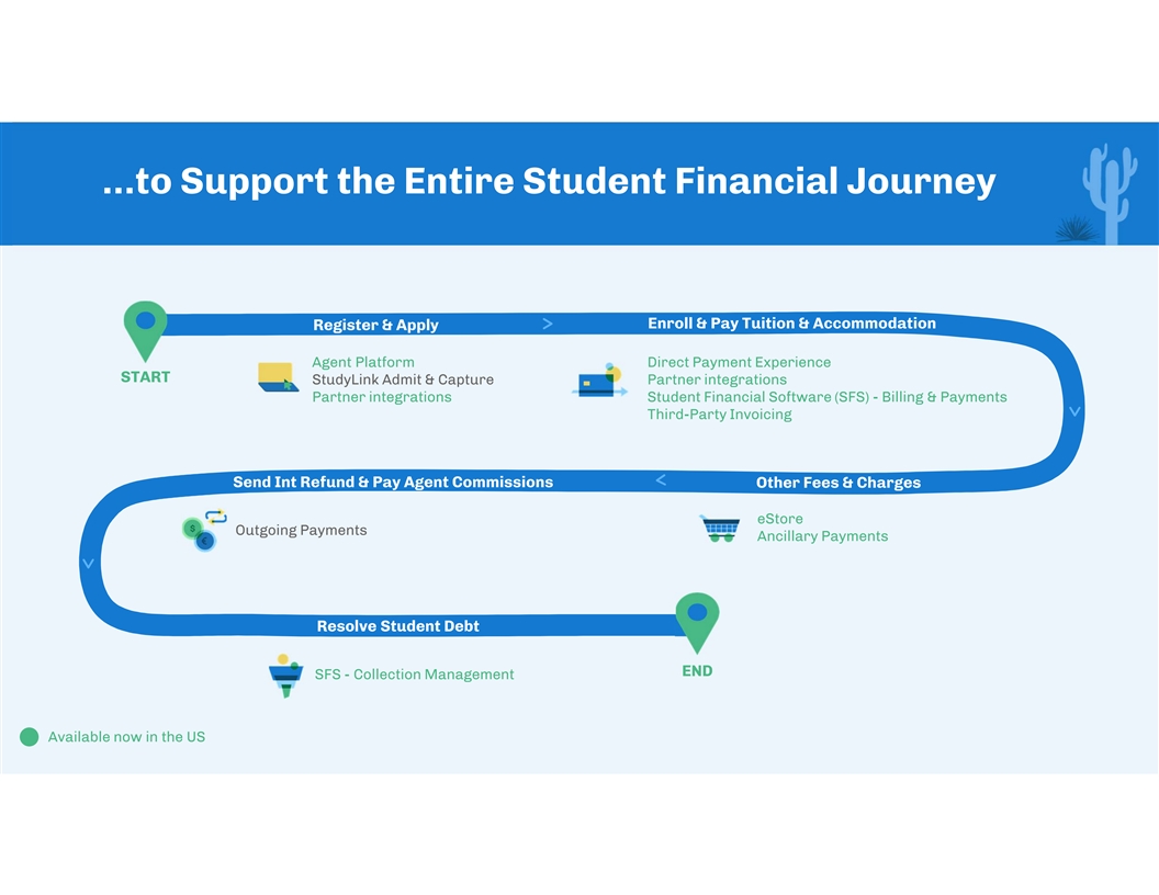 > > …to Support the Entire Student Financial Journey Enroll & Pay Tuition & Accommodation Register & Apply > Agent Platform Direct Payment Experience START StudyLink Admit & Capture Partner integrations Partner integrations Student Financial Software (SFS) - Billing & Payments Third-Party Invoicing Send Int Refund & Pay Agent Commissions Other Fees & Charges eStore Outgoing Payments Ancillary Payments Resolve Student Debt END SFS - Collection Management Available now in the US