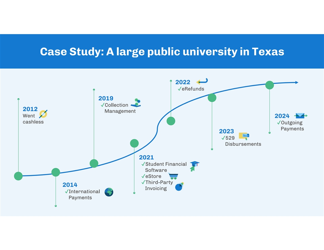 Case Study: A large public university in Texas 2022 ✔eRefunds 2019 ✔Collection 2012 Management Went 2024 cashless ✔Outgoing Payments 2023 ✔529 Disbursements 2021 ✔Student Financial Software ✔eStore ✔Third-Party 2014 Invoicing ✔International Payments