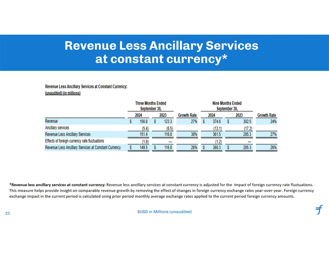 Revenue Less Ancillary Services at constant currency* $USD in Millions (unaudited) 22