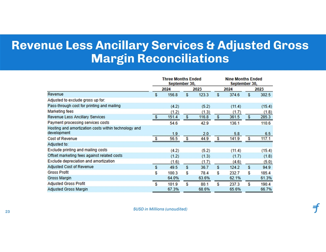 Revenue Less Ancillary Services & Adjusted Gross Margin Reconciliations $USD in Millions (unaudited) 23