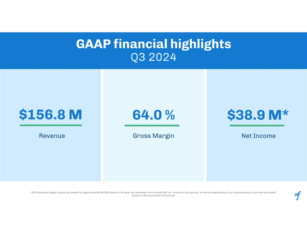 GAAP financial highlights Q3 2024 $156.8 M 64.0 % $38.9 M* Revenue Gross Margin Net Income *Q3 includes a higher income tax benefit of approximately $8.3M based on full year tax estimates, which amplified our income in the quarter, driven by seasonality of our business and a one-time tax benefit based on the acquisition of Invoiced.