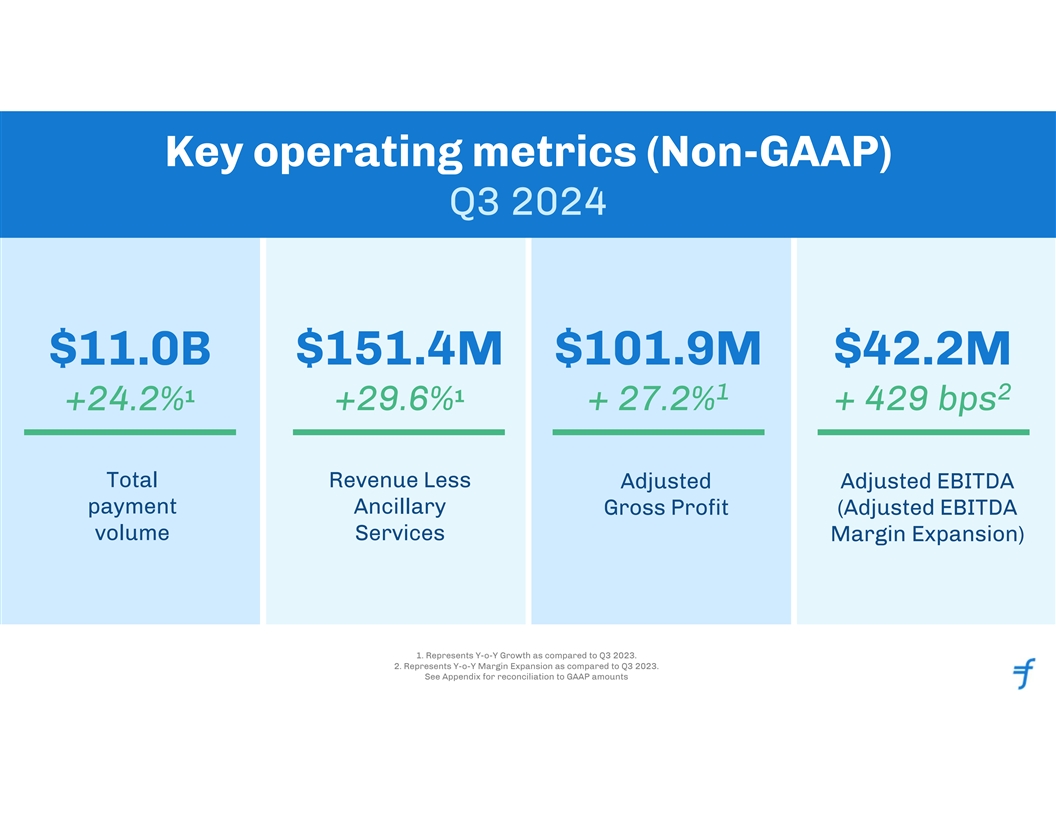 Key operating metrics (Non-GAAP) Q3 2024 $11.0B $151.4M $101.9M $42.2M 1 2 1 1 +24.2% +29.6% + 27.2% + 429 bps Total Revenue Less Adjusted Adjusted EBITDA payment Ancillary Gross Profit (Adjusted EBITDA volume Services Margin Expansion) 1. Represents Y-o-Y Growth as compared to Q3 2023. 2. Represents Y-o-Y Margin Expansion as compared to Q3 2023. See Appendix for reconciliation to GAAP amounts